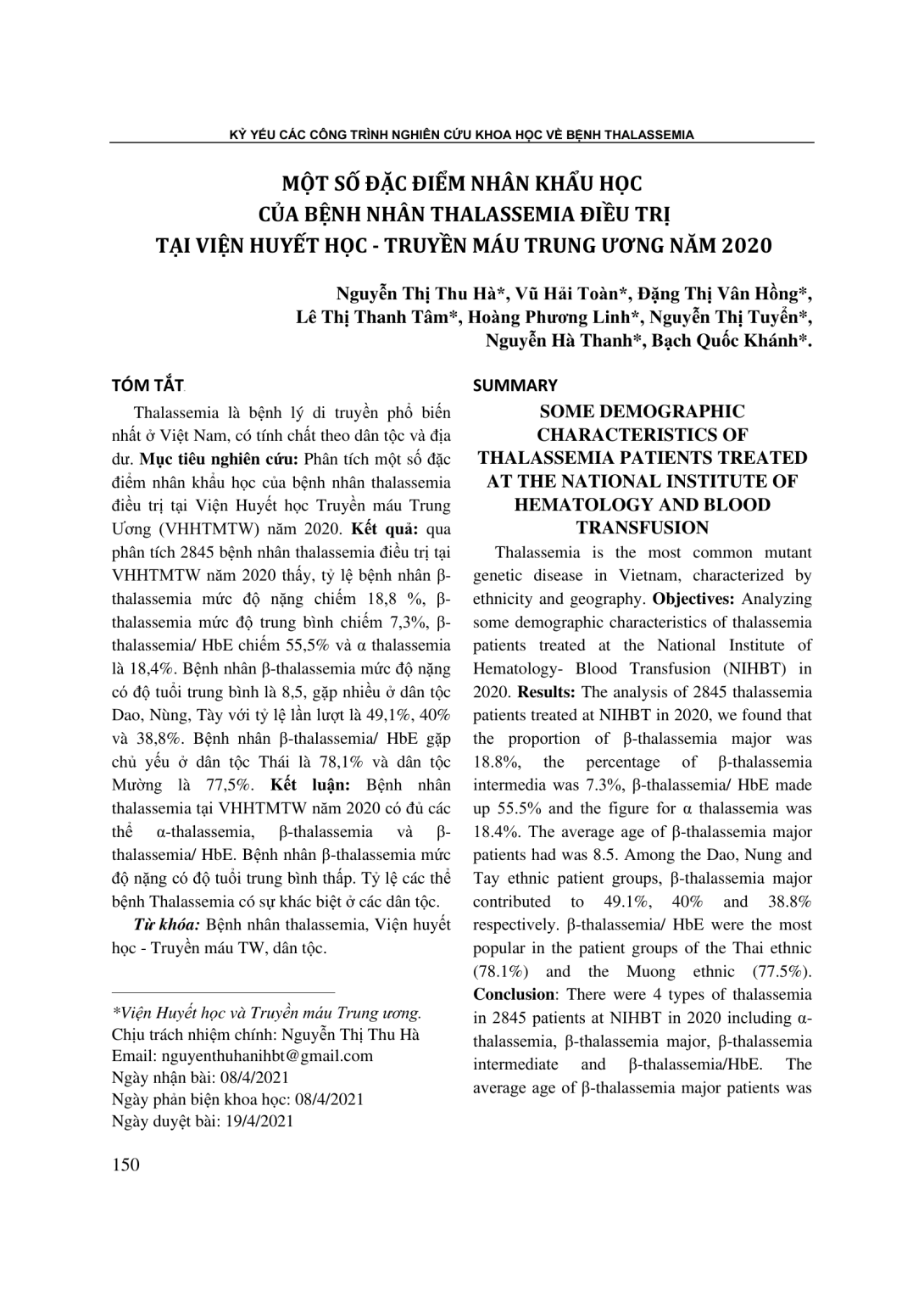 Thalassemia là bệnh lý di truyền phổ biến nhất ở Việt Nam, có tính chất theo dân tộc và địa dư. Mục tiêu nghiên cứu: Phân tích một số đặc điểm nhân khẩu học của bệnh nhân thalassemia điều trị tại Viện Huyết học Truyền máu Trung Ương (VHHTMTW) năm 2020. Kết quả: qua phân tích 2845 bệnh nhân thalassemia điều trị tại VHHTMTW năm 2020 thấy, tỷ lệ bệnh nhân β-thalassemia mức độ nặng chiếm 18,8 %, β-thalassemia mức độ trung bình chiếm 7,3%, β-thalassemia/ HbE chiếm 55,5% và α thalassemia là 18,4%. Bệnh nhân β-thalassemia mức độ nặng có độ tuổi trung bình là 8,5, gặp nhiều ở dân tộc Dao, Nùng, Tày với tỷ lệ lần lượt là 49,1%, 40% và 38,8%. Bệnh nhân β-thalassemia/ HbE gặp chủ yếu ở dân tộc Thái là 78,1% và dân tộc Mường là 77,5%. Kết luận: Bệnh nhân thalassemia tại VHHTMTW năm 2020 có đủ các thể α-thalassemia, β-thalassemia và β-thalassemia/ HbE. Bệnh nhân β-thalassemia mức độ nặng có độ tuổi trung bình thấp. Tỷ lệ các thể bệnh Thalassemia có sự khác biệt ở các dân tộc.
