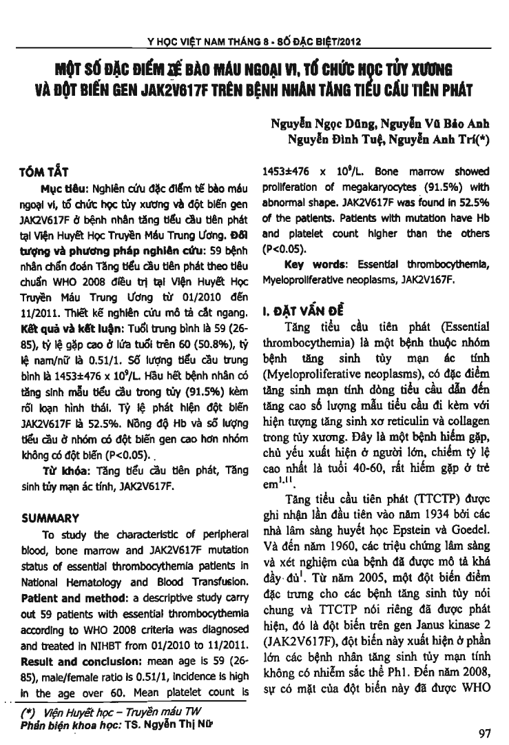 To study the characteristic of peripheral blood, bone marrow and JAK2V617F mutation status of essential thrombocythemia patients in National Hematology and Blood Transfusion. Patient and method: a descriptive study carry out 59 patients with essential thrombocythemia according to WHO 2008 criteria was diagnosed and treated in NIHBT from 01/2010 to 11/2011. Result and conclusion: mean age is 59 (26-85), male/female ratio is 0.51/1, incidence is high in the age over 60. Mean platelet count is 1453 + or - 476 x 10 exponent 9 /L. Bone marrow showed proliferation of megakaryocytes (91.5 percent) with abnormal shape. JAK2V617F was found in 52.5 percent of the patients. Patients with mutation have Hb and platelet count higher than the others (P0.05).