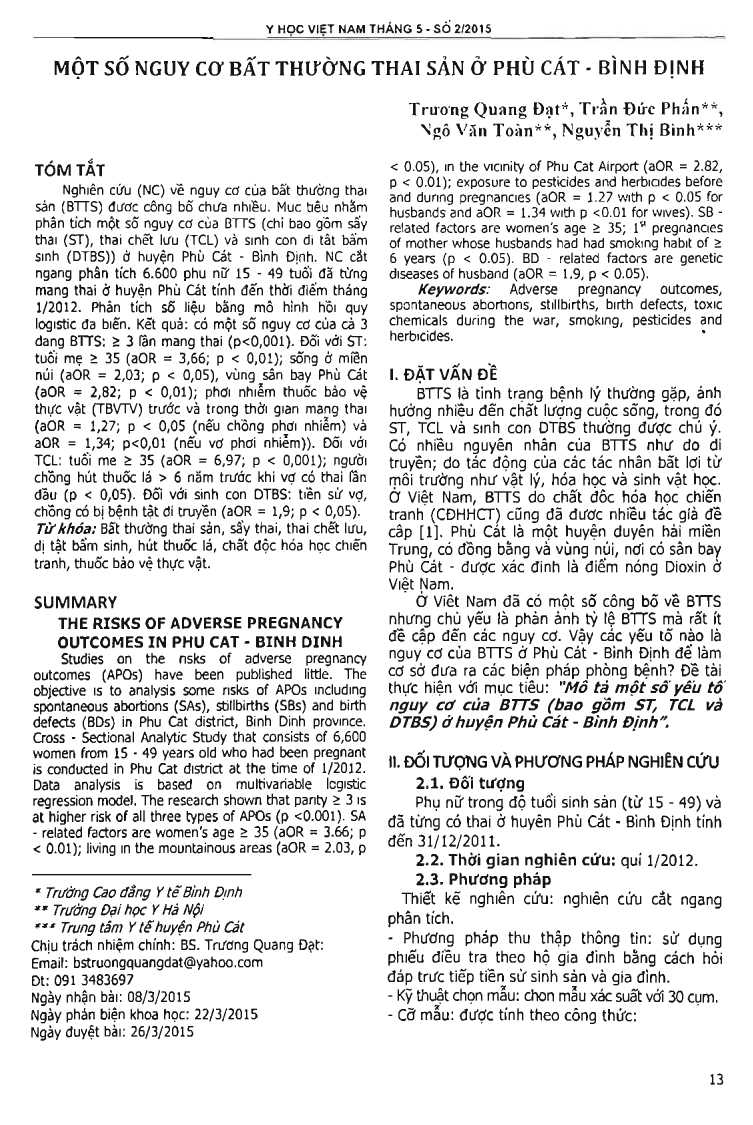 Studies on the risks of adverse pregnancy outcomes (APOs) have been published little. The objective is to analysis some risks of APOs including spontaneous abortions (SAs), stillbirths (SBs) and birth defects (BDs) in Phu Cat district, Binh Dinh province. Cross-sectional analytic study that consists of 6,600 women from 15 - 49 years old who had been pregnant is conducted in Phu Cat district at the time of 1/2012. Data analysis is based on multivariable logistic regression model. The research shown that parity or = 3 is at higher risk of all three types of APOs (p 0.001). SA - related factors are women's age or = 35 (aOR = 3.66; p 0.01); living in the mountainous areas (aOR or = 35; 1st pregnancies of mother whose husbands had had smoking habit of or = 6 years (p 0.05). BD - related factors are genetic diseases of husband (aOR