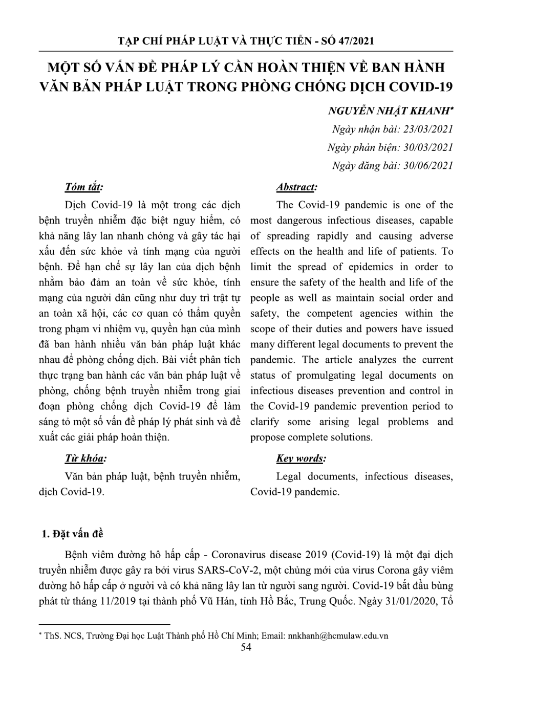 Dịch Covid-19 là một trong các dịch bệnh truyền nhiễm đặc biệt nguy hiểm, có khả năng lây lan nhanh chóng và gây tác hại xấu đến sức khỏe và tính mạng của người bệnh. Để hạn chế sự lây lan của dịch bệnh nhằm bảo đảm an toàn về sức khỏe, tính mạng của người dân cũng như duy trì trật tự an toàn xã hội, các cơ quan có thẩm quyền trong phạm vi nhiệm vụ, quyền hạn của mình đã ban hành nhiều văn bản pháp luật khác nhau để phòng chống dịch. Bài viết phân tích thực trạng ban hành các văn bản pháp luật về phòng, chống bệnh truyền nhiễm trong giai đoạn phòng chống dịch Covid-19 để làm sáng tỏ một số vấn đề pháp lý phát sinh và đề xuất các giải pháp hoàn thiện.