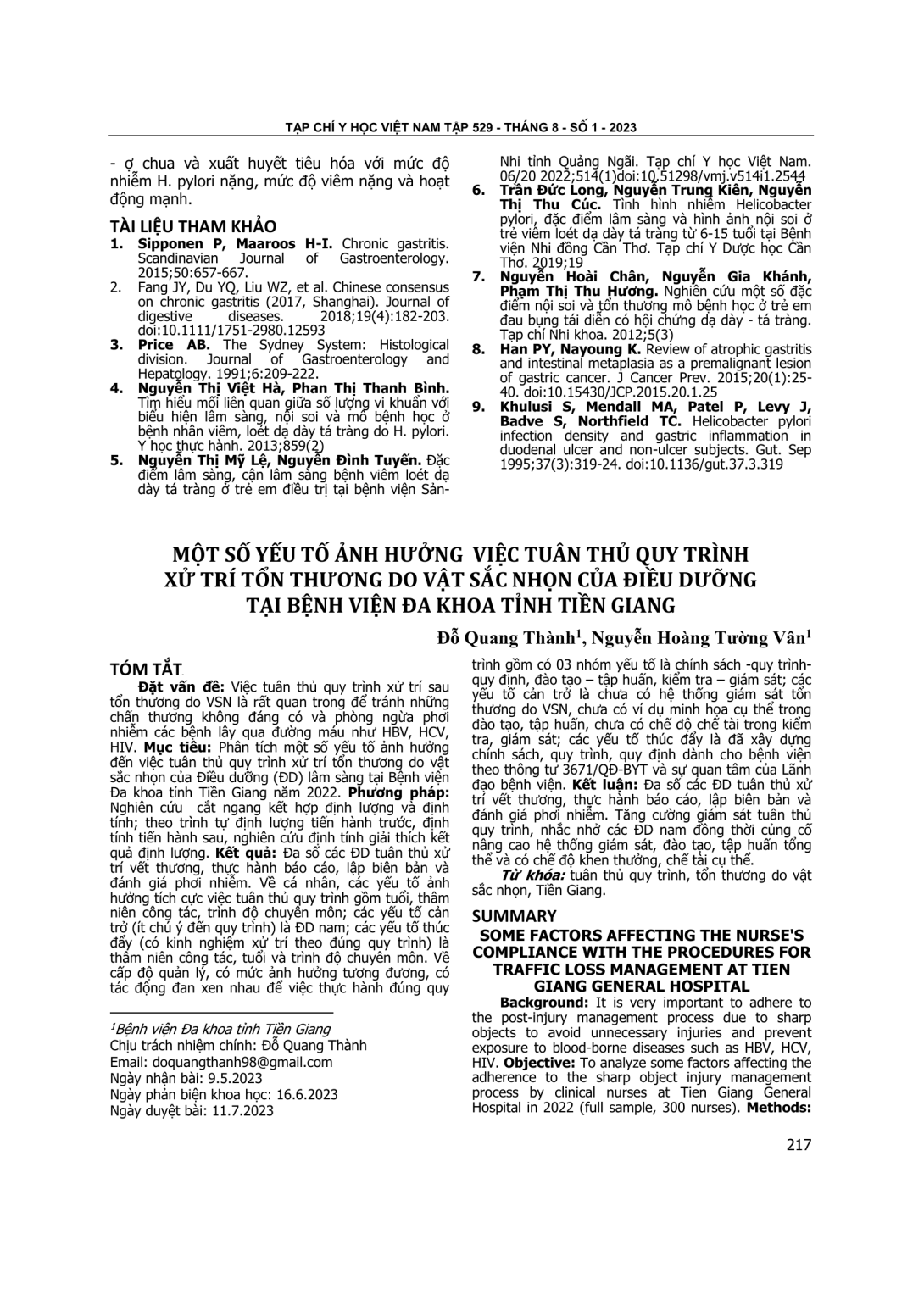 Phân tích một số yếu tố ảnh hưởng đến việc tuân thủ quy trình xử trí tổn thương do vật sắc nhọn của Điều dưỡng (ĐD) lâm sàng tại Bệnh viện Đa khoa tỉnh Tiền Giang năm 2022. Phương pháp: Nghiên cứu cắt ngang kết hợp định lượng và định tính; theo trình tự định lượng tiến hành trước, định tính tiến hành sau, nghiên cứu định tính giải thích kết quả định lượng. Kết quả: Đa số các ĐD tuân thủ xử trí vết thương, thực hành báo cáo, lập biên bản và đánh giá phơi nhiễm. Về cá nhân, các yếu tố ảnh hưởng tích cực việc tuân thủ quy trình gồm tuổi, thâm niên công tác, trình độ chuyên môn; các yếu tố cản trở (ít chú ý đến quy trình) là ĐD nam; các yếu tố thúc đẩy (có kinh nghiệm xử trí theo đúng quy trình) là thâm niên công tác, tuổi và trình độ chuyên môn. Về cấp độ quản lý, có mức ảnh hưởng tương đương, có tác động đan xen nhau để việc thực hành đúng quy trình gồm có 03 nhóm yếu tố là chính sách -quy trình- quy định, đào tạo – tập huấn, kiểm tra – giám sát; các yếu tố cản trở là chưa có hệ thống giám sát tổn thương do VSN, chưa có ví dụ minh họa cụ thể trong đào tạo, tập huấn, chưa có chế độ chế tài trong kiểm tra, giám sát; các yếu tố thúc đẩy là đã xây dựng chính sách, quy trình, quy định dành cho bệnh viện theo thông tư 3671/QĐ-BYT và sự quan tâm của Lãnh đạo bệnh viện. Kết luận: Đa số các ĐD tuân thủ xử trí vết thương, thực hành báo cáo, lập biên bản và đánh giá phơi nhiễm. Tăng cường giám sát tuân thủ quy trình, nhắc nhở các ĐD nam đồng thời củng cố nâng cao hệ thống giám sát, đào tạo, tập huấn tổng thể và có chế độ khen thưởng, chế tài cụ thể.