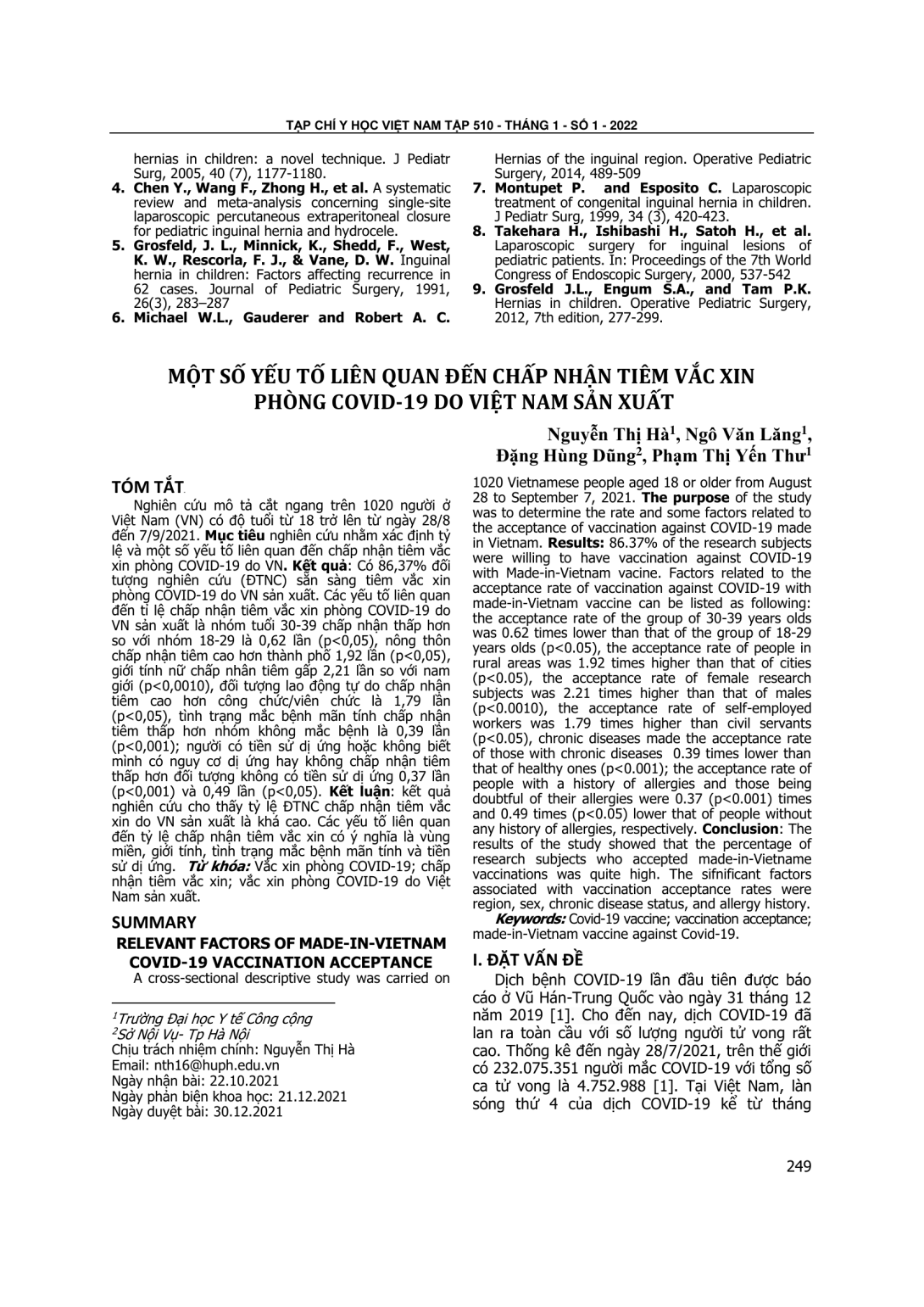 A cross-sectional descriptive study was carried on 1020 Vietnamese people aged 18 or older from August 28 to September 7, 2021. The purpose of the study was to determine the rate and some factors related to the acceptance of vaccination against COVID-19 made in Vietnam. Results: 86.37% of the research subjects were willing to have vaccination against COVID-19 with Made-in-Vietnam vacine. Factors related to the acceptance rate of vaccination against COVID-19 with made-in-Vietnam vaccine can be listed as following: the acceptance rate of the group of 30-39 years olds was 0.62 times lower than that of the group of 18-29 years olds (p<0.05), the acceptance rate of people in rural areas was 1.92 times higher than that of cities (p<0.05), the acceptance rate of female research subjects was 2.21 times higher than that of males (p<0.0010), the acceptance rate of self-employed workers was 1.79 times higher than civil servants (p<0.05), chronic diseases made the acceptance rate of those with chronic diseases 0.39 times lower than that of healthy ones (p<0.001); the acceptance rate of people with a history of allergies and those being doubtful of their allergies were 0.37 (p<0.001) times and 0.49 times (p<0.05) lower that of people without any history of allergies, respectively. Conclusion: The results of the study showed that the percentage of research subjects who accepted made-in-Vietname vaccinations was quite high. The sifnificant factors associated with vaccination acceptance rates were region, sex, chronic disease status, and allergy history.