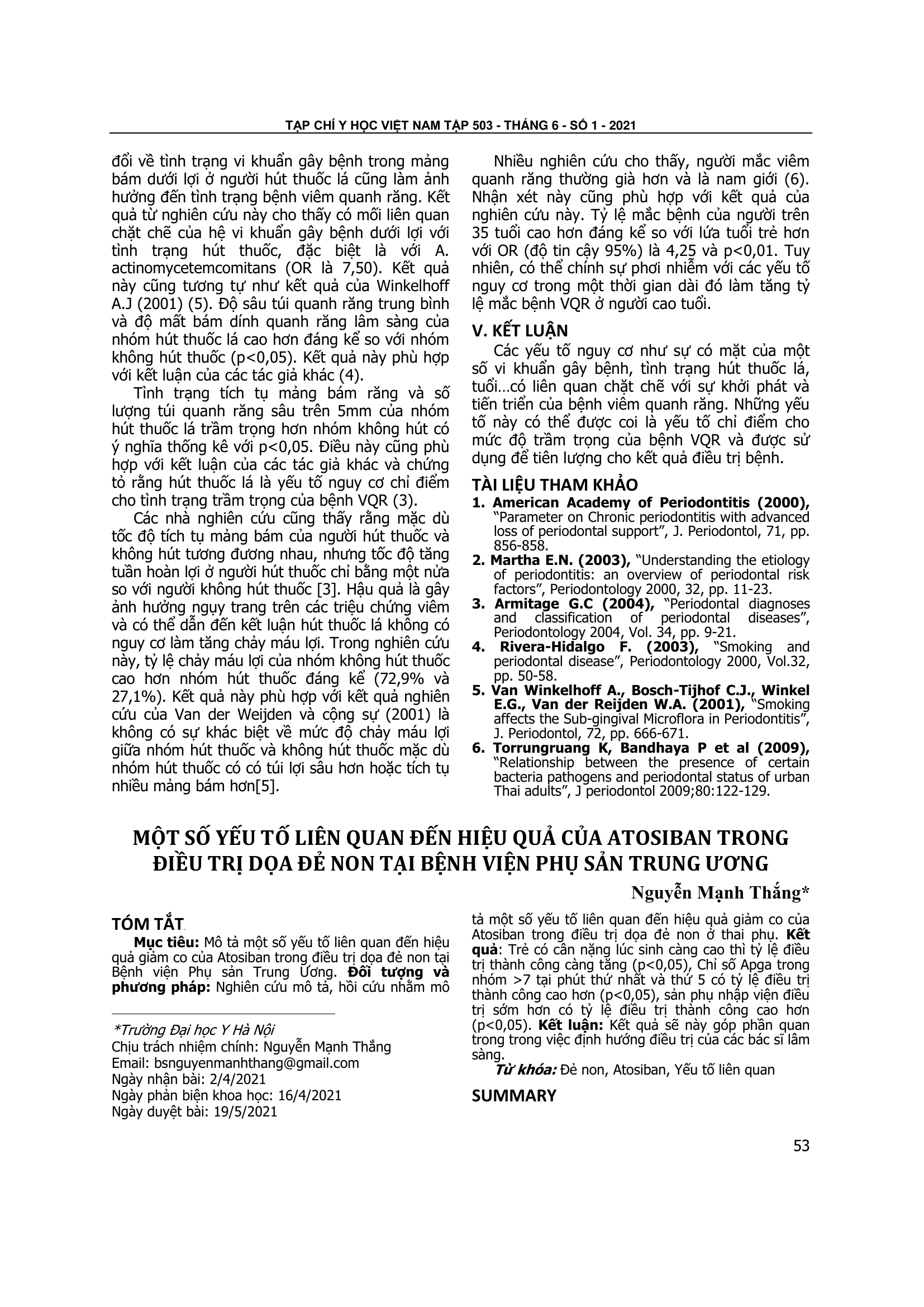 Mô tả một số yếu tố liên quan đến hiệu quả giảm co của Atosiban trong điều trị dọa đẻ non tại Bệnh viện Phụ sản Trung Ương. Đối tượng và phương pháp: Nghiên cứu mô tả, hồi cứu nhằm mô tả một số yếu tố liên quan đến hiệu quả giảm co của Atosiban trong điều trị dọa đẻ non ở thai phụ. Kết quả: Trẻ có cân nặng lúc sinh càng cao thì tỷ lệ điều trị thành công càng tăng (p<0,05), Chỉ số Apga trong nhóm >7 tại phút thứ nhất và thứ 5 có tỷ lệ điều trị thành công cao hơn (p<0,05), sản phụ nhập viện điều trị sớm hơn có tỷ lệ điều trị thành công cao hơn (p<0,05). Kết luận: Kết quả sẽ này góp phần quan trong trong việc định hướng điều trị của các bác sĩ lâm sàng.