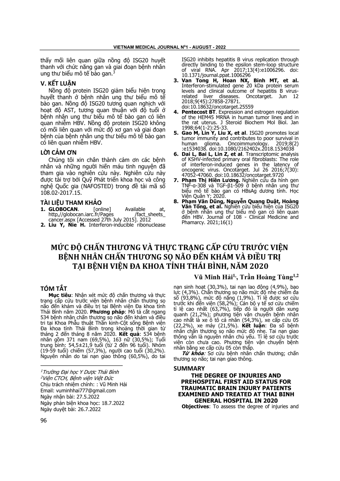 Nhận xét mức độ chấn thương và thực trạng cấp cứu trước viện bệnh nhân chấn thương sọ não đến khám và điều trị tại Bệnh viện Đa khoa tỉnh Thái Bình năm 2020. Phương pháp: Mô tả cắt ngang 534 bệnh nhân chấn thương sọ não đến khám và điều tri tại Khoa Phẫu thuật Thần kinh-Cột sống Bệnh viện Đa khoa tỉnh Thái Bình trong khoảng thời gian từ tháng 2 đến tháng 8 năm 2020. Kết quả: 534 bệnh nhân gồm 371 nam (69,5%), 163 nữ (30,5%); Tuổi trung bình: 54,5±21,9 tuổi (từ 2 đến 96 tuổi). Nhóm (19-59 tuổi) chiếm (57,3%), người cao tuổi (30,2%). Nguyên nhân do tai nạn giao thông (60,5%), do tai nạn sinh hoạt (30,3%), tai nạn lao động (4,9%), bạo lực (4,3%). Chấn thương sọ não mức độ nhẹ chiếm đa số (93,8%), mức độ nặng (1,9%). Tỉ lệ được sơ cứu trước khi đến viện (58,2%); Cán bộ y tế sơ cứu chiếm tỉ lệ cao nhất (63,7%), tiếp đó là người dân xung quanh (21,2%); phương tiện vận chuyển bệnh nhân cao nhất là xe ô tô cá nhân (54,3%), xe cấp cứu 05 (22,2%), xe máy (21,5%). Kết luận: Đa số bệnh nhân chấn thương sọ não mức độ nhẹ. Tai nạn giao thông vẫn là nguyên nhân chủ yếu. Tỉ lệ sơ cứu trước viện còn chưa cao. Phương tiện vận chuyển bệnh nhân bằng xe cấp cứu 05 còn thấp.