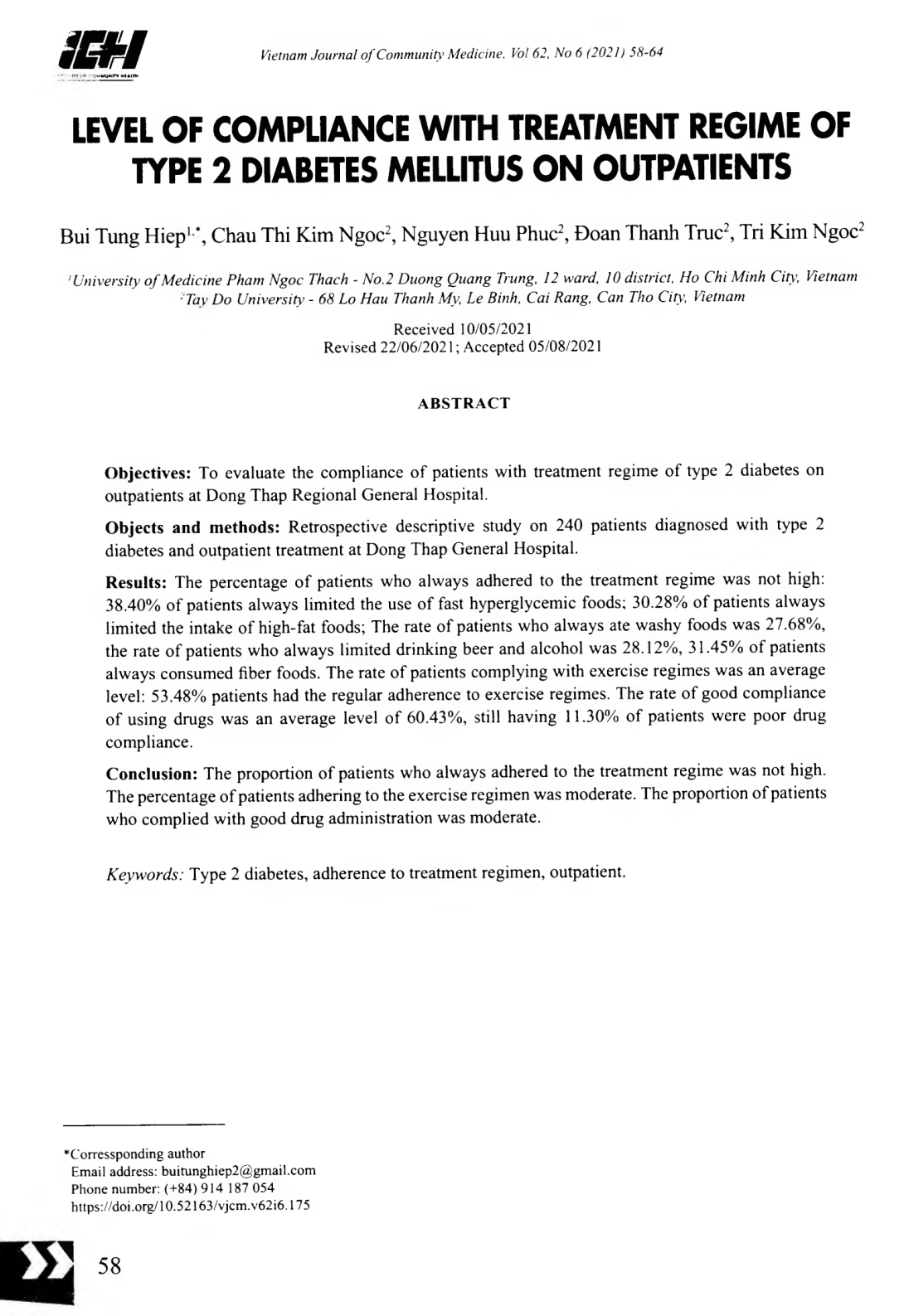 Đánh giá mức độ tuân thủ chế độ điều trị của bệnh nhân đái tháo đường type 2 điều trị ngoại trú tại Bệnh viện đa khoa khu vực Đồng Tháp. Nghiên cứu mô tả hồi cứu trên 240 bệnh nhân được chẩn đoán mắc đái tháo đường type 2, điều trị ngoại trú tại Bệnh viện Đa khoa Đồng Tháp. Tỷ lệ bệnh nhân luôn tuân thủ chế độ ăn chưa cao: Có 38,40% bệnh nhân luôn hạn chế sử dụng các thực phẩm tăng đường huyết nhanh; có 30,28% bệnh nhân luôn hạn chế ăn thực phẩm nhiều chất béo; tỷ lệ bệnh nhân luôn ăn nhạt là 27,68%; tỷ lệ bệnh nhân luôn hạn chế uống bia, rượu là 28,12%; có 31,45% bệnh nhân luôn luôn ăn chất xơ. Tỷ lệ bệnh nhân tuân thủ chế độ tập luyện ở mức trung bình: 53,48% thường xuyên tuân thủ chế độ tập luyện. Tỷ lệ bệnh nhân tuân thủ dùng thuốc tốt ở mức trung bình là 60,43%, vẫn có 11,30% bệnh nhân tuân thủ dùng thuốc kém. Tỷ lệ bệnh nhân luôn tuân thủ chế độ ăn chưa cao. Tỷ lệ bệnh nhân tuân thủ chế độ tập luyện ở mức trung bình. Tỷ lệ bệnh nhân tuân thủ dùng thuốc tốt ở mức trung bình.