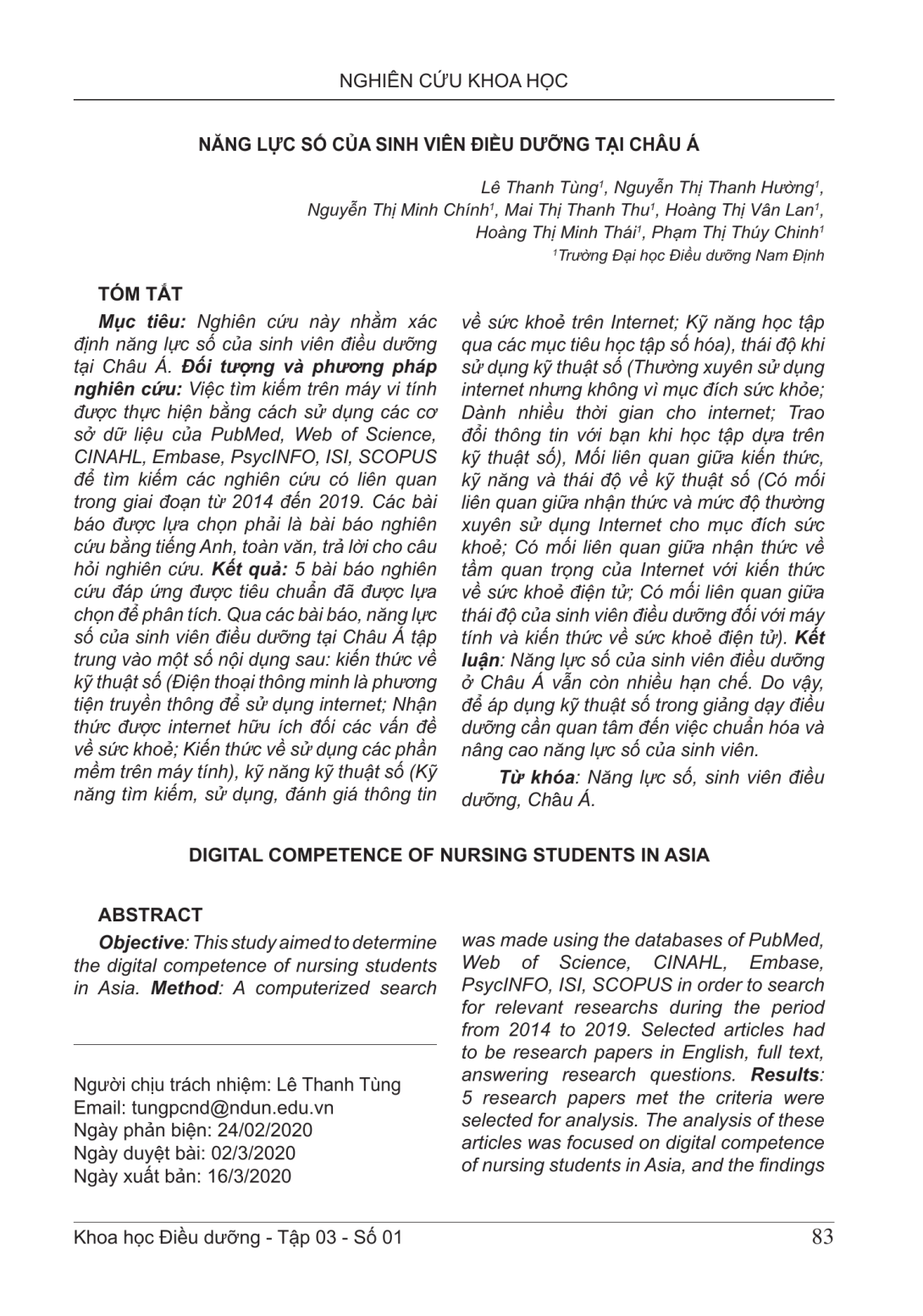 Nghiên cứu này nhằm xác định năng lực số của sinh viên điều dưỡng tại Châu Á. Đối tượng và phương pháp nghiên cứu Việc tìm kiếm trên máy vi tính được thực hiện bằng cách sử dụng các cơ sở dữ liệu của PubMed, Web of Science, CINAHL, Embase, PsycINFO, ISI, SCOPUS để tìm kiếm các nghiên cứu có liên quan trong giai đoạn từ 2014 đến 2019. Các bài báo được lựa chọn phải là bài báo nghiên cứu bằng tiếng Anh, toàn văn, trả lời cho câu hỏi nghiên cứu. Kết quả 5 bài báo nghiên cứu đáp ứng được tiêu chuẩn đã được lựa chọn để phân tích. Qua các bài báo, năng lực số của sinh viên điều dưỡng tại Châu Á tập trung vào một số nội dụng sau kiến thức về kỹ thuật số (Điện thoại thông minh là phương tiện truyền thông để sử dụng internet; Nhận thức được internet hữu ích đối các vấn đề về sức khoẻ; Kiến thức về sử dụng các phần mềm trên máy tính), kỹ năng kỹ thuật số (Kỹ năng tìm kiếm, sử dụng, đánh giá thông tin về sức khoẻ trên Internet; Kỹ năng học tập qua các mục tiêu học tập số hóa), thái độ khi sử dụng kỹ thuật số (Thường xuyên sử dụng internet nhưng không vì mục đích sức khỏe; Dành nhiều thời gian cho internet; Trao đổi thông tin với bạn khi học tập dựa trên kỹ thuật số), Mối liên quan giữa kiến thức, kỹ năng và thái độ về kỹ thuật số (Có mối liên quan giữa nhận thức và mức độ thường xuyên sử dụng Internet cho mục đích sức khoẻ; Có mối liên quan giữa nhận thức về tầm quan trọng của Internet với kiến thức về sức khoẻ điện tử; Có mối liên quan giữa thái độ của sinh viên điều dưỡng đối với máy tính và kiến thức về sức khoẻ điện tử).