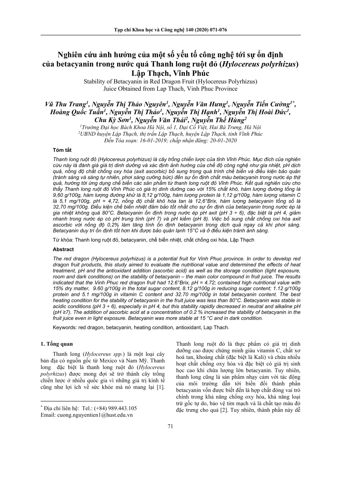 Thanh long ruột đỏ (Hylocereus polyrhizus) là cây trồng chiến lược của tỉnh Vĩnh Phúc. Mục đích của nghiên cứu này là đánh giá giá trị dinh dưỡng và xác định ảnh hưởng của chế độ công nghệ như gia nhiệt, pH dịch quả, nồng độ chất chống oxy hóa (axit ascorbic) bổ sung trong quá trình chế biến và điều kiện bảo quản (tránh sáng và sáng tự nhiên, phơi sáng cưỡng bức) đến sự ổn định chất màu betacyanin trong nước ép thịt quả, hướng tới ứng dụng chế biến các sản phẩm từ thanh long ruột đỏ Vĩnh Phúc. Kết quả nghiên cứu cho thấy Thanh long ruột đỏ Vĩnh Phúc có giá trị dinh dưỡng cao với 15% chất khô, hàm lượng đường tổng là 9,60 g/100g, hàm lượng đường khử là 8,12 g/100g, hàm lượng protein là 1,12 g/100g, hàm lượng vitamin C là 5,1 mg/100g, pH = 4,72, nồng độ chất khô hòa tan là 12,6°Brix, hàm lượng betacyanin tổng số là 32,70 mg/100g. Điều kiện chế biến nhiệt đảm bảo tốt nhất cho sự ổn định của betacyanin trong nước ép là gia nhiệt không quá 80°C. Betacyanin ổn định trong nước ép pH axit (pH 3 ÷ 6), đặc biệt là pH 4, giảm nhanh trong nước ép có pH trung tính (pH 7) và pH kiềm (pH 8). Việc bổ sung chất chống oxi hóa axit ascorbic với nồng độ 0,2% làm tăng tính ổn định betacyanin trong dịch quả ngay cả khi phơi sáng. Betacyanin duy trì ổn định tốt hơn khi được bảo quản lạnh 15°C và ở điều kiện tránh ánh sáng.