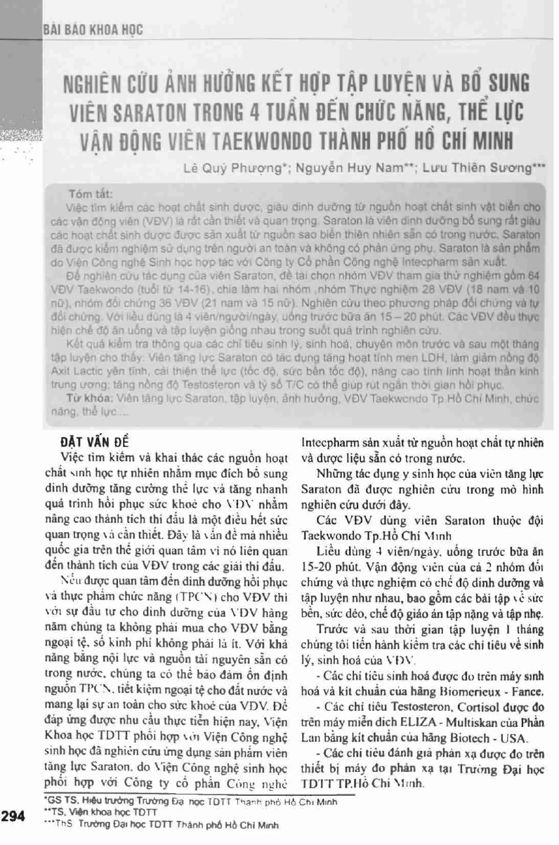 Nghiên cứu ảnh hưởng kết hợp tập luyện và bổ sung viên saraton trong 4 tuần đến chức năng, thể lực vận động viên Taekwondo TP Hồ Chí Minh