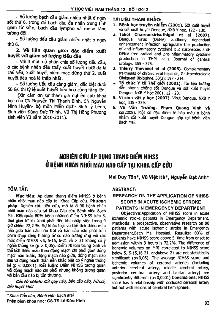 Objective:Application of NIHSS score in acute ischemic stroke patients in Emergency Department. Methods: a prospective, observative research on 90 patients with acute ischemic stroke in Emergency Department, Bach Mai Hospital. Results: 80 percent of patients have NIHSS score above 5, time from onset to admission within 9 hours is 72.2 percent. The difference of ischemic volumes on MRI correlated to NIHSS score below 5; 5-15,16-21, and above 21 are not statistically significant (p0.05). The average NIHSS score and ischemic volumes of cerebral arteries (including anterior cerebral artery, middle cerebral artery, posterior cerebral artery and basilar artery) are significantly different (p0.0001). Conciusions: NIHSS score has a relationship with occluded cerebral artery but not with lesions of cerebral hemisphere.