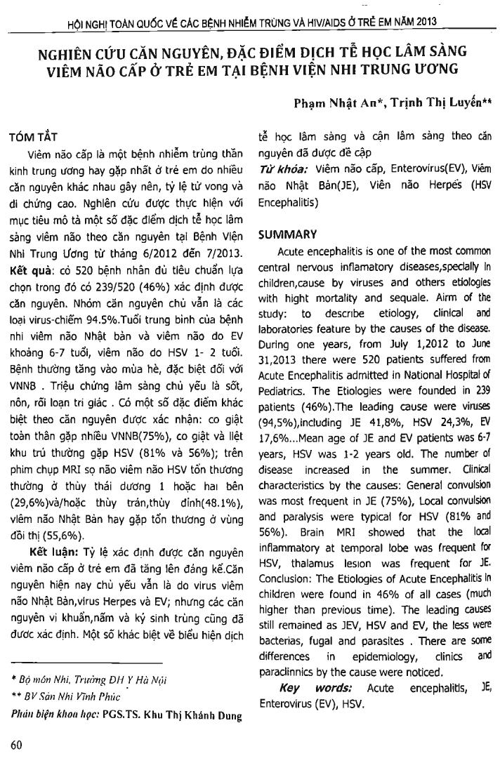 Acute encephalitis is one of the most common central nervous inflamatory diseases,specially in children,cause by viruses and others etiologies with hight mortality and sequale. Airm of the study: to describe etiology, clinical and laboratories feature by the causes of the disease. During one years, from July 2012 to June 2013 there were 520 patients suffered from Acute Encephalitis admitted in National Hospital of Pediatrics. The Etiologies were founded in 239 patients (46 percent).The leading cause were viruses (94,5 percent),including JE 41,8 percent, HSV 24,3 percent, EV 17,6 percent...Mean age of JE and EV patients was 6-7 years, HSV was 1-2 years. old. The number of disease increased in the summer. Clinical characteristics by the causes: General convulsion was most frequent in JE (75 percent), Local convulsion and paralysis were typical for HSV (81 percent and 56 percent). Brain MRI showed that the local inflammatory at temporal lobe was frequent for HSV, thalamus lesion was frequent for JE. Conclusion: The Etiologies of Acute Encephalitis in children were found in 46 percent of all cases (much higher than previous time). The leading causes still remained as JEV, HSV and EV, the less were bacterias, fugal and parasites. There are some differences in epidemiology, clinics and paraclinnics by the cause were noticed.
