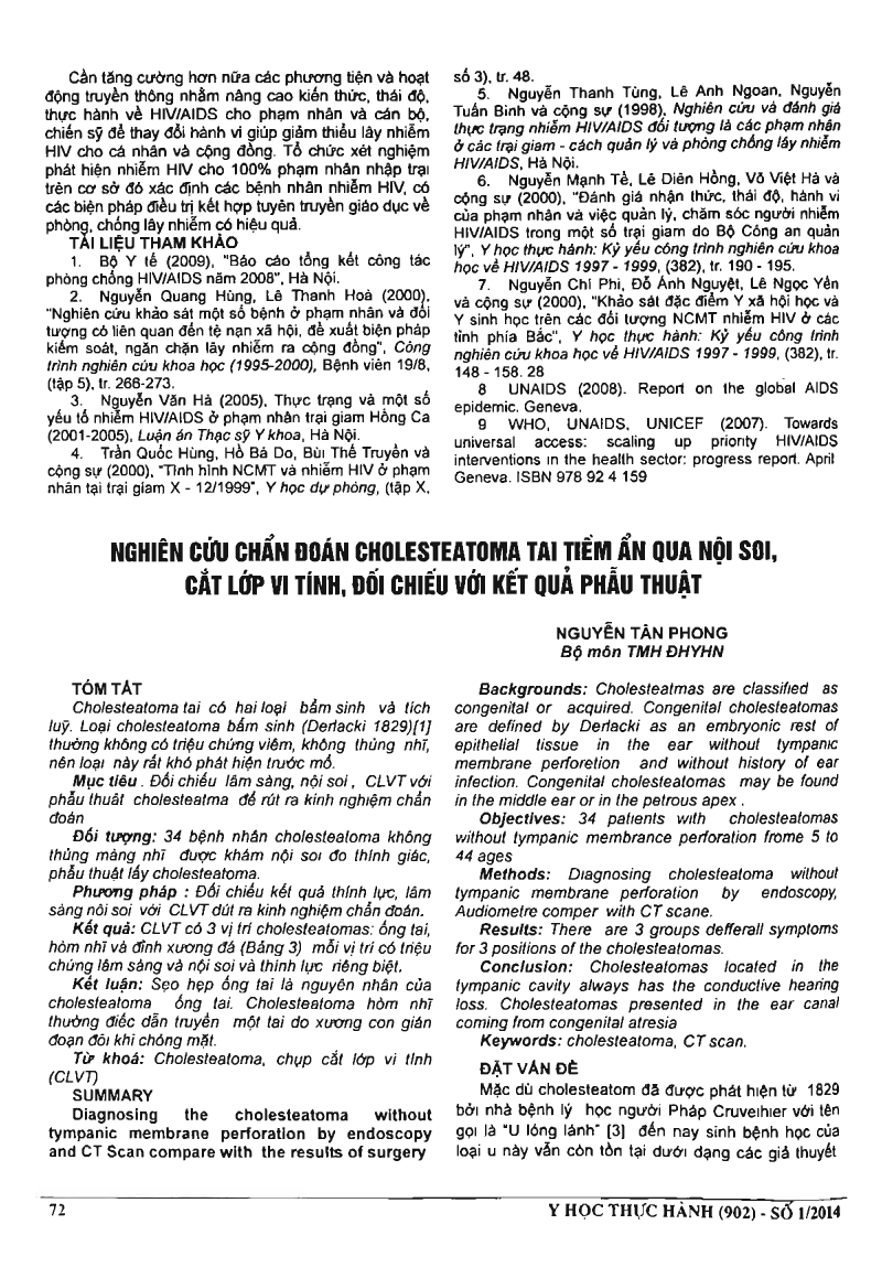Backgrounds: Cholesteatmas are classified as congenital or acquired. Congenital cholesteatomas are defined by Derlacki as an embryonic rest of epithelial tissue in the ear without tympanic membrane perforetion and without history of ear infection. Congenital cholesteatomas may be found in the middle ear or in the petrous apex. Objectives: 34 patient's with cholesteatomas without tympanic membra nee perforation frome 5 to 44 ages. Methods: Diagnosing cholesteatoma without tympanic membrane perforation by endoscopy, Audiometre comper with CT scane. Results: There are 3 groups defferall symptoms for 3 positions of the cholesteatomas. Conclusion: Cholesteatomas located in the tympanic cavity always has the conductive hearing loss. Cholesteatomas presented in the ear canal coming from congenital atresia.