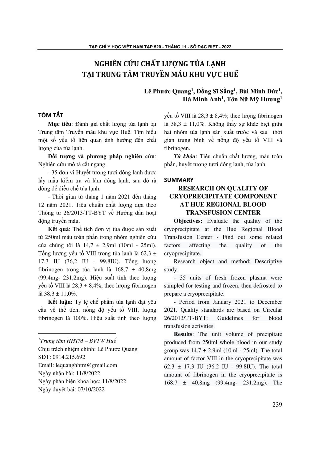 Evaluate the quality of the cryoprecipitate at the Hue Regional Blood Transfusion Center - Find out some related factors affecting the quality of the cryoprecipitate.. Research object and method: Descriptive study. - 35 units of fresh frozen plasma were sampled for testing and frozen, then defrosted to prepare a cryoprecipitate. - Period from January 2021 to December 2021. Quality standards are based on Circular 26/2013/TT-BYT: Guidelines for blood transfusion activities. Results: The unit volume of precipitate produced from 250ml whole blood in our study group was 14.7 ± 2.9ml (10ml - 25ml). The total amount of factor VIII in the cryoprecipitate was 62.3 ± 17.3 IU (36.2 IU - 99.8IU). The total amount of fibrinogen in the cryoprecipitate is 168.7 ± 40.8mg (99.4mg- 231.2mg). The efficiency calculated by the amount of factor VIII is 28.3 ± 8.4% ; according to the amount of fibrinogen is 38.3 ± 11.0%. Conclusion: - The percentage of frozen preparations meeting the requirements in terms of volume, factor VIII concentration, and fibrinogen amount is 100%. The efficiency calculated by the amount of factor VIII is 28.3 ± 8.4% ; according to the amount of fibrinogen is 38.3 ± 11.0%. There was no difference in production time between the two groups of cryoprecipitate before and after the mean time in factor VIII and fibrinogen concentrations.