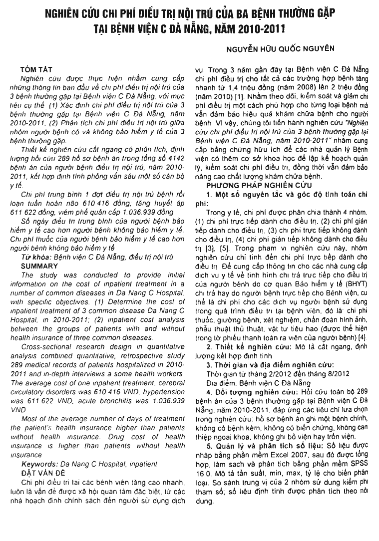 Nghiên cứu chi phí điều trị nội trú của 3 bệnh thường gặp tại bệnh viện C, Đà Nẵng, năm 2010-2011