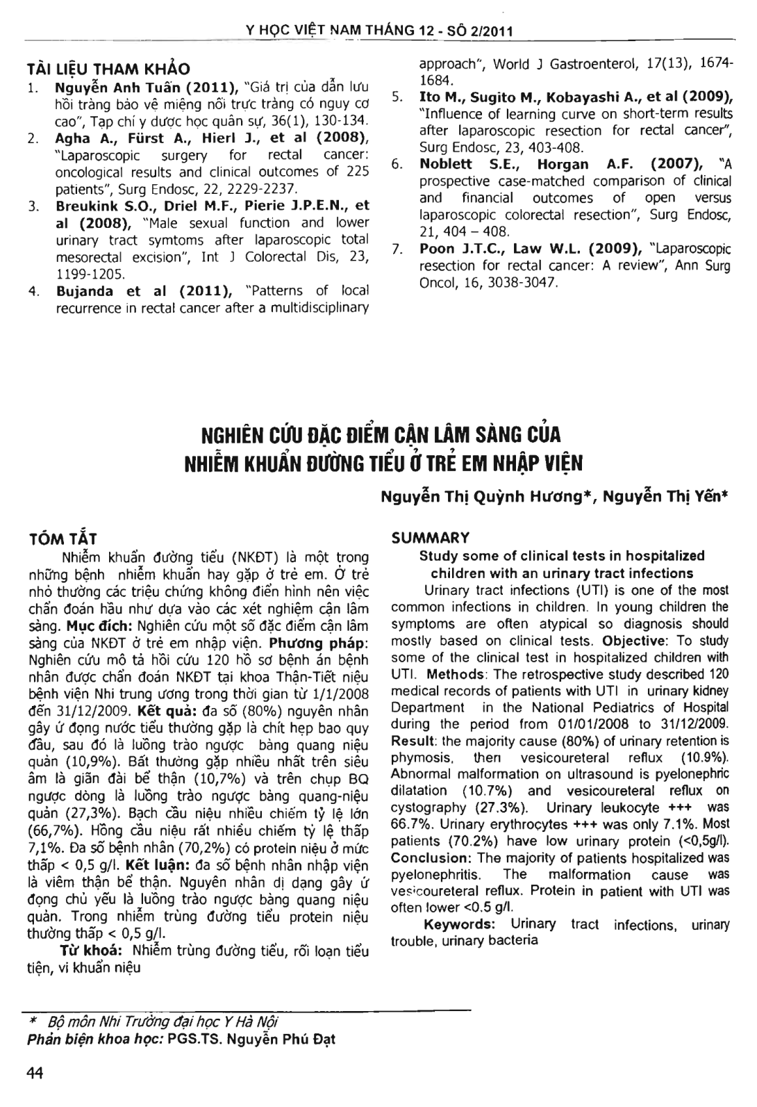 Urinary tract infections (UTI) is one of the most common infections in children. In young children the symptoms are often atypical so diagnosis should mostly based on clinical tests. Objective: To study some of the clinical test in hospitalized children with UTI. Methods: The retrospective study described 120 medical records of patients with UTI in urinary kidney Department in the National Pediatrics of Hospital during the period from 01/01/2008 to 31/12/2009. Result: the majority cause (80 percent) of urinary retention is phymosis, then vesicoureteral reflux (10.9 percent). Abnormal malformation on ultrasound is pyelonephric dilatation (10.7 percent) and vesicoureteral reflux on cystography (27.3 percent). Urinary leukocyte +++ was 66.7 percent. Urinary erythrocytes +++ was only 7.1 percent. Most patients (70.2 percent) have low urinary protein (0.5g/l). Conclusion: The majority of patients hospitalized was pyelonephritis. The malformation cause was vecicoureteral reflux. Protein in patient with UTI was often lower 0.5 g/l.