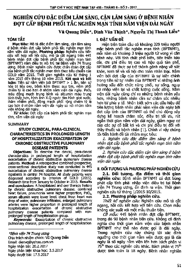 Nghiên cứu đặc điểm lâm sàng, cận lâm sàng ở bệnh nhân đợt cấp bệnh phổi tắc nghẽn mạn tính nằm viện dày ngày từ 01/2015 đến 10/2015. Tiền sử nàm viện bởi bẹnh phổi tắc nghẹn mãn tính là trên 1 lần, tiền sử hóa trị liệu oxy, bệnh suy tim, viêm phổi kèm theo chiếm tỷ lệ cao hơn ở nhóm nằm viện dài ngày. PaO2 máu động mạch. albumin máu trung bình thấp hơn, tim hình giọt nước, thâm nhiễm phổi, động mạch phổi rộng trên X quang ngực chiếm tỷ lệ cao hơn ở nhóm nằm viện dài ngày so với nhóm không nằm viện dài ngày.