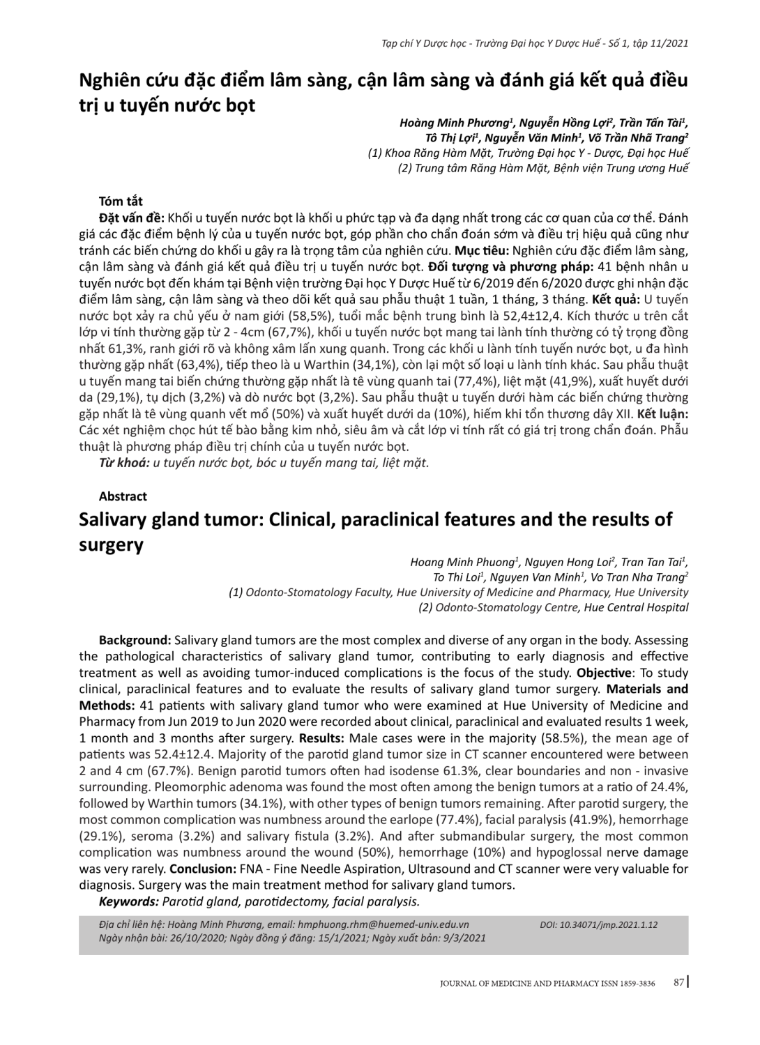 Salivary gland tumors are the most complex and diverse of any organ in the body. Assessing the pathological characteristics of salivary gland tumor, contributing to early diagnosis and effective treatment as well as avoiding tumor-induced complications is the focus of the study. Objective: To study clinical, paraclinical features and to evaluate the results of salivary gland tumor surgery. Materials and Methods: 41 patients with salivary gland tumor who were examined at Hue University of Medicine and Pharmacy from Jun 2019 to Jun 2020 were recorded about clinical, paraclinical and evaluated results 1 week, 1 month and 3 months after surgery. Results: Male cases were in the majority (58.5%), the mean age of patients was 52.4±12.4. Majority of the parotid gland tumor size in CT scanner encountered were between 2 and 4 cm (67.7%). Benign parotid tumors often had isodense 61.3%, clear boundaries and non - invasive surrounding. Pleomorphic adenoma was found the most often among the benign tumors at a ratio of 24.4%, followed by Warthin tumors (34.1%), with other types of benign tumors remaining. After parotid surgery, the most common complication was numbness around the earlope (77.4%), facial paralysis (41.9%), hemorrhage (29.1%), seroma (3.2%) and salivary fistula (3.2%). And after submandibular surgery, the most common complication was numbness around the wound (50%), hemorrhage (10%) and hypoglossal nerve damage was very rarely. Conclusion: FNA - Fine Needle Aspiration, Ultrasound and CT scanner were very valuable for diagnosis. Surgery was the main treatment method for salivary gland tumors.