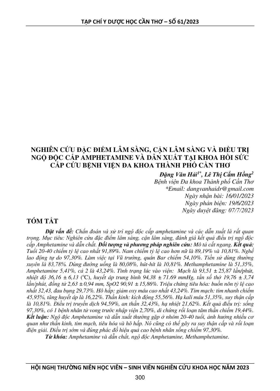 Nghiên cứu đặc điểm lâm sàng, cận lâm sàng, đánh giá kết quả điều trị ngộ độc cấp Amphetamine và dẫn chất. Đối tượng và phương pháp nghiên cứu: Mô tả cắt ngang. Kết quả: Tuổi 20-40 chiếm tỷ lệ cao nhất 91,89%. Nam chiếm tỷ lệ cao hơn nữ là 89,19% và 10,81%. Nghề lao động tự do 97,30%. Làm việc tại Vũ trường, quán Bar chiếm 54,10%. Tiền sử dùng thường xuyên là 83,78%. Dùng đường uống là 80,08%, hút-hít là 10,81%. Methamphetamine là 51,35%, Amphetamine 5,41%, cả 2 là 43,24%. Tình trạng lúc vào viện: Mạch là 93,51 ± 25,87 lần/phút, nhiệt độ 36,16 ± 6,13 (oC), huyết áp trung bình 94,38 ± 71.69 mmHg, tần số thở 19,76 ± 3,74 lần/phút, đồng tử 2,63 ± 0,94 mm, SpO2 90,91 ± 15,86%. Triệu chứng tiêu hóa: buồn nôn tỷ lệ cao nhất 32,43, đau bụng 29,73%. Hô hấp: giảm oxy máu cao nhất 43,24%. Tim mạch: tim nhanh chiếm 45,95%, tăng huyết áp là 16,22%. Thần kinh: kích động 55,56%. Hạ kali máu 51,35%, suy thận cấp là 10,81%. Điều trị truyền dịch 94,59%, an thần 32,43%, hạ nhiệt 21,62%. Kết quả điều trị: sống 97,30%, có 1 bệnh nhân tử vong trước nhập viện 2,70%, di chứng rối loạn tâm thần chiếm 19,44%. Kết luận: Ngộ độc Amphetamine và dẫn xuất thường gặp ở nhóm 20-40 tuổi, ảnh hưởng nhiều cơ quan như thần kinh, tim mạch, tiêu hóa và hô hấp. Nó cũng có thể gây ra suy thận cấp và rối loạn điện giải. Điều trị sớm và đúng phác đồ hiệu quả cao bệnh nhân sống chiếm 97,30%.