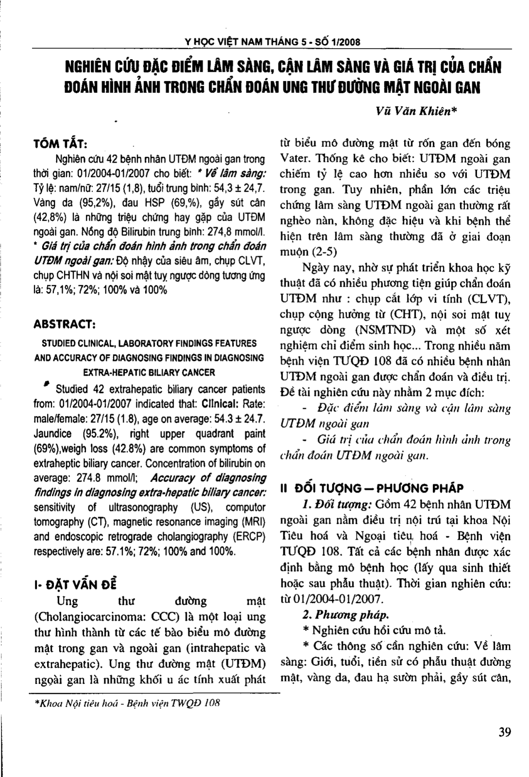 Nghiên cứu đặc điểm lâm sàng, cận lâm sàng và giá trị của chẩn đoán hình ảnh trong chẩn đoán ung thư đường mật ngoài gan