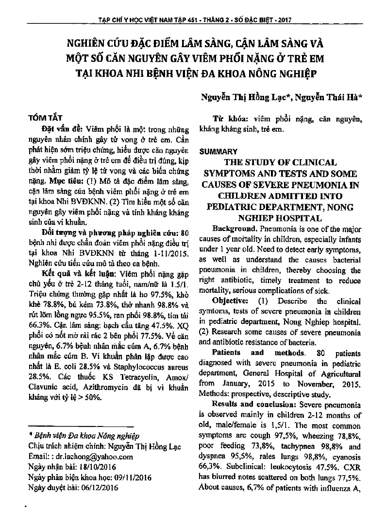 Nghiên cứu đặc điểm lâm sàng, cận lâm sàng và một số căn nguyên gây viêm phổi nặng ở trẻ em tại Khoa Nhi, bệnh viện Đa khoa Nông nghiệp