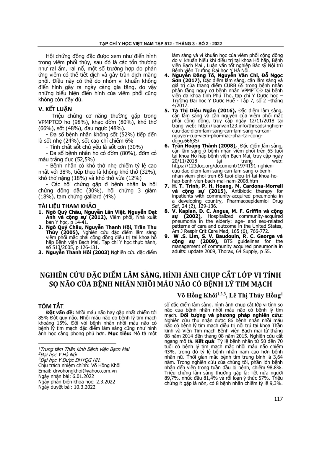Mô tả một số đặc điểm lâm sàng, hình ảnh chụp cắt lớp vi tính sọ não của bệnh nhân nhồi máu não có bệnh lý tim mạch. Đối tượng và phương pháp nghiên cứu: Nghiên cứu thu nhận được 86 bệnh nhân nhồi máu não có bệnh lý tim mạch điều trị nội trú tại khoa Thần kinh và Viện Tim mạch Bệnh viện Bạch mai từ tháng 08 năm 2014 đến tháng 08 năm 2015. Nghiên cứu cắt ngang mô tả. Kết quả: Tỷ lệ bệnh nhân từ 50 đến 70 tuổi có bệnh lý tim mạch mắc nhồi máu não chiếm 43%, trong đó tỷ lệ bệnh nhân nam cao hơn bệnh nhân nữ. Thời gian mắc bệnh tim trung bình là 3,64 năm. Trong nghiên cứu của chúng tôi, phần lớn bệnh nhân đến viện trong tuần đầu bị bệnh, chiếm 98,8%. Triệu chứng lâm sàng thường gặp là: liệt nửa người 89,7%, nhức đầu 81,4% và rối loạn ý thức 57%. Triệu chứng ít gặp là nôn, có 8 bệnh nhân chiếm tỷ lệ 9,3%. Số ngày nằm viện trung bình là 16,38 ngày. Phần lớn bệnh nhân bị nhồi máu não theo chi phối của động mạch não giữa 73 bệnh nhân, chiếm 84,9% và kích thước nhỏ chiếm 57%. Kết luận: Nhồi máu não có bệnh lý tim mạch hay gặp ở độ tuổi 50 đến 70. Những bệnh nhân có bệnh lý tim mạch thường mắc nhồi máu não trong vòng 5 năm kể từ khi phát hiện bệnh lý tim mạch. Bệnh nhân thường đến viện trong tuần đầu tiên của bệnh với các triệu chứng phổ biến như liệt nửa người, đau đầu và rối loạn ý thức. Đa số bệnh nhân có nhồi máu não với kích thước nhỏ trên phim CLVT sọ não, phần lớn thuộc vùng cấp máu động mạch não giữa. Thời gian điều trị trong khoảng 2 tuần.