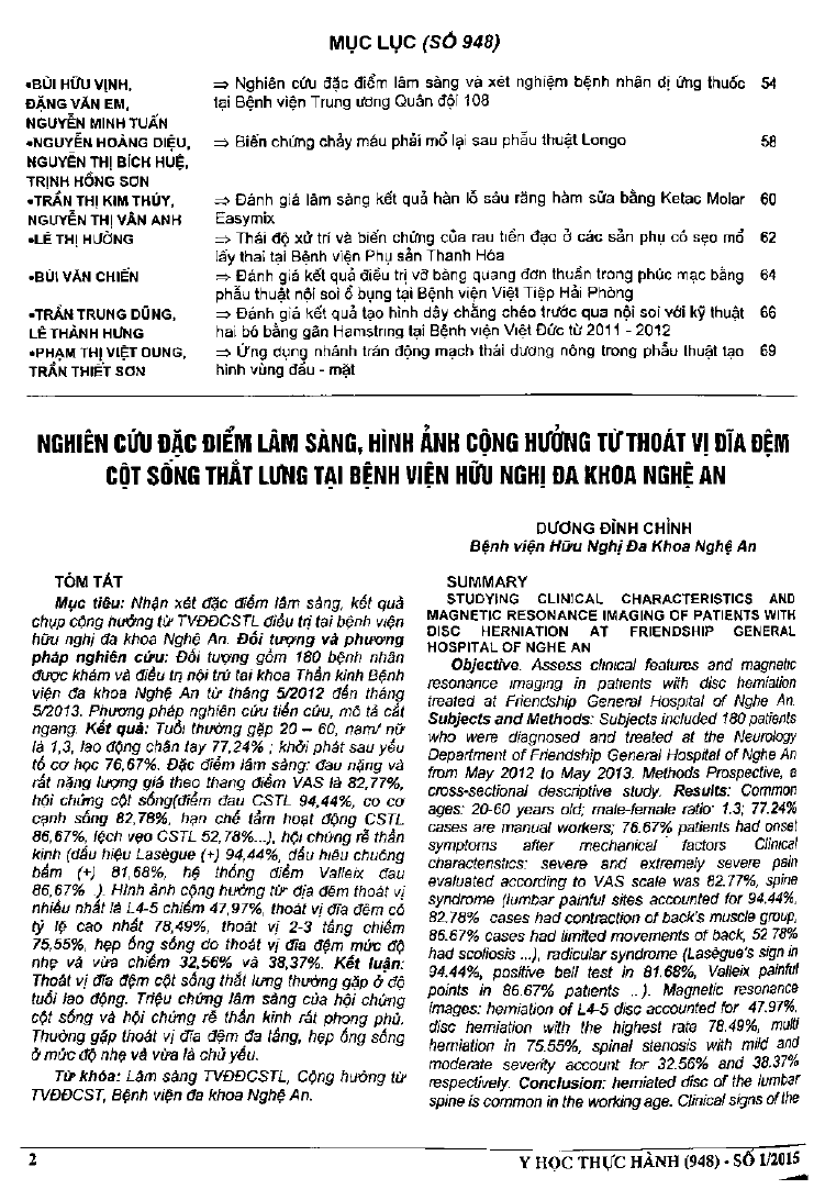 Objective: Assess clinical feati/res and magnetic resonance imaging in patients with disc hemiation treated at Friendship General Hospital of Nghe An. Subjects and Methods: Subjects included 180 patients who were diagnosed and treated at the Neurology Department of Friendship General Hospital of Nghe An from May 2012 to May 2013. Methods Prospective, a cross-sectional descriptive study. Results: Common ages: 20-60 years old; male-female ratio: 1.3; 77.24 percent cases are manual workers; 76.67 percent patients had onset symptoms after mechanical' [actors. Clinical characteristics: severe and extremely severe pain evaluated according to VAS scale was 82.77 percent, spine syndrome (lumbar painful sites accounted for 94.44 percent, 82.78 percent cases had contraction of back's muscle group, 86.67 percent cases had limited movements of back, 52.78 percent had scoliosis ...), radicular syndrome (Lasegue's sign in 94.44 percent, positive bell test in 81.68 percent, Valleix painful points in 86.67 percent patients ...). Magnetic resonance images: hemiation of L4-5 disc accounted for 47.97 percent, disc hemiation with the highest rate 78.49 percent, multi hemiation in 75.55 percent, spinal stenosis with mild and moderate severity account for 32.56 percent and 38.37 percent respectively. Conclusion: hemiated disc of the lumbar spine is common in the working age. Clinical signs of the spinal syndrome and radicular syndrome is various. Majority of patients had multi disc hemiation, spinal stenosis at mild and moderate severity.