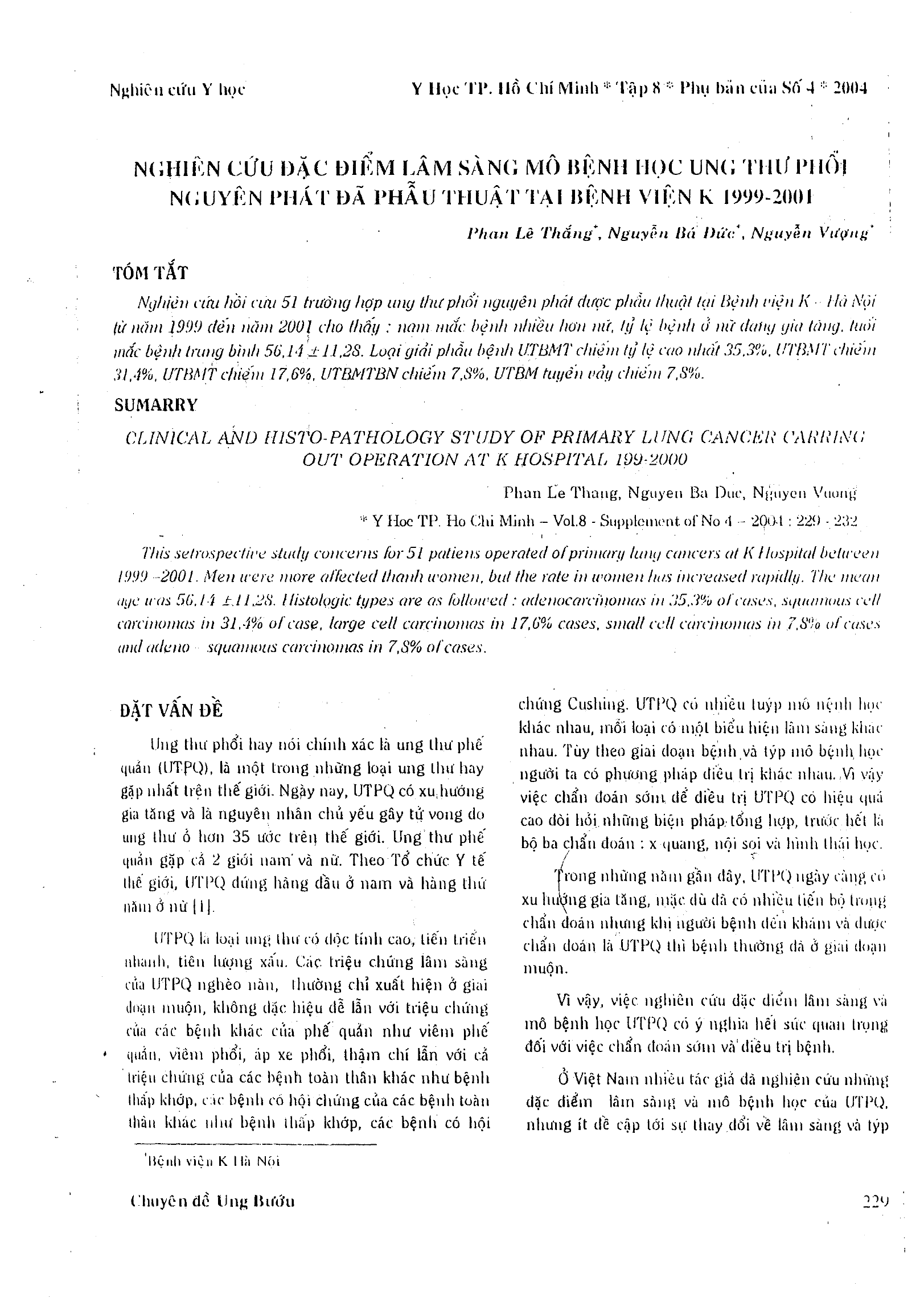Nghiên cứu đặc điểm lâm sàng mô bệnh học ung thư phổi nguyên phát đã phẫu thuật tại Bệnh viện K 1999 - 2001