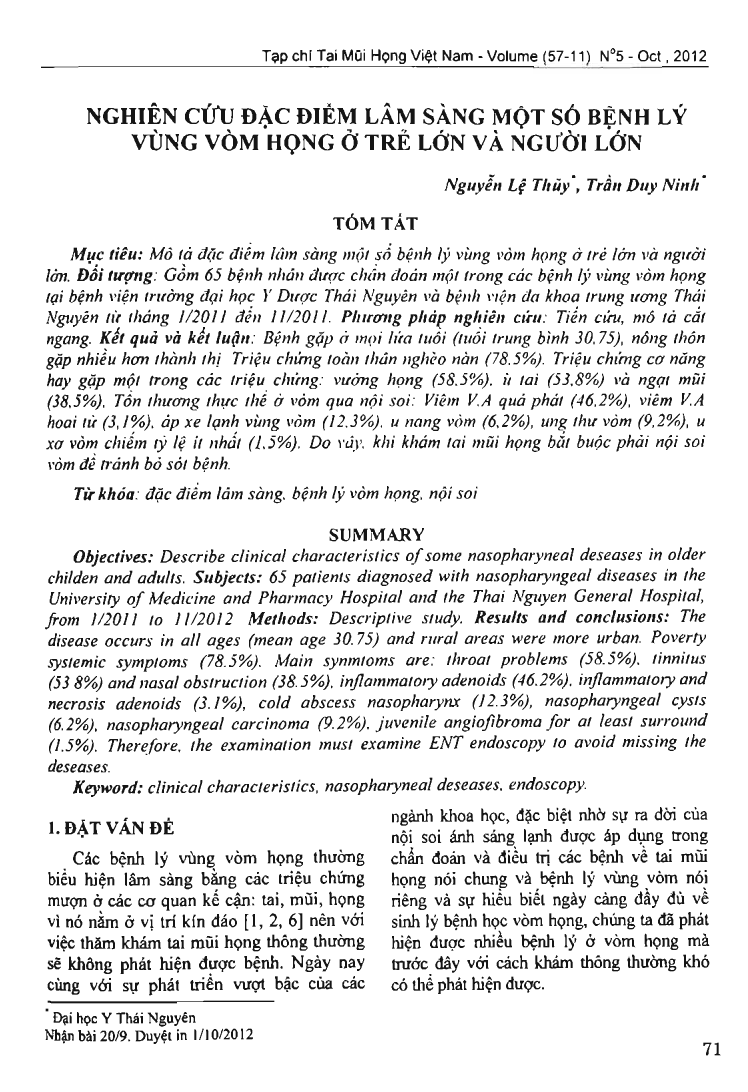 Objectives: Describe clinical characteristics of some nasopharyneal diseases in older childen and adults. Subjects: 65 patients diagnosed with nasopharyngeal diseases in the University of Medicine and Pharmacy Hospital and the Thai Nguyen General Hospital, from 1/2011 to 11/2012. Methods: Descriptive study. Results and conclusions: The disease occurs in all ages (mean age 30.75) and rural areas were more urban. Poverty systemic symptoms (78.5 percent). Main synmtoms are: throat problems (58.5 percent), tinnitus (53.8 percent) and nasal obstruction (38.5 percent), inflammatory adErzoids (46.2 percent), inflammatory and necrosis adenoids (3.1 percent), cold abscess nasopharynx (12.3 percent), nasopharyngeal cysts (6.2 percent), nasopharyngeal carcinoma (9.2 percent), juvenile angiofibroma for at least surround (1.5 percent). Therefore, the examination must examine ENT endoscopy to avoid missing the diseases.