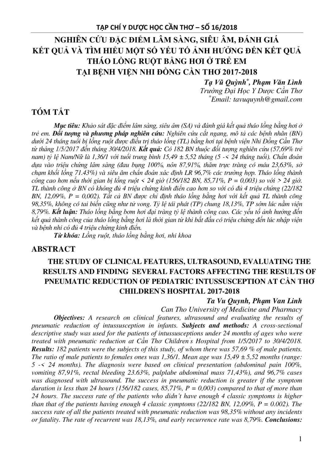 Khảo sát đặc điểm lâm sàng, siêu âm (SA) và đánh giá kết quả tháo lồng bằng hơi ở trẻ em. Đối tượng và phương pháp nghiên cứu Nghiên cứu cắt ngang, mô tả các bệnh nhân (BN) dưới 24 tháng tuổi bị lồng ruột được điều trị tháo lồng (TL) bằng hơi tại bệnh viện Nhi Đồng Cần Thơ từ tháng 1/5/2017 đến tháng 30/4/2018. Kết quả Có 182 BN thuộc đối tượng nghiên cứu (57,69% trẻ nam) tỷ lệ Nam/Nữ là 1,36/1 với tuổi trung bình 15,49 ± 5,52 tháng (5 -< 24 tháng tuổi). Chẩn đoán dựa vào triệu chứng lâm sàng (đau bụng 100%, nôn 87,91%, thăm trực tràng có máu 23,63%, sờ chạm khối lồng 71.43%) và siêu âm chẩn đoán xác định LR 96,7% các trường hợp. Tháo lồng thành công cao hơn nếu thời gian bị lồng ruột < 24 giờ (156/182 BN, 85,71%, P = 0,003) so với > 24 giờ. TL thành công ở BN có không đủ 4 triệu chứng kinh điển cao hơn so với có đủ 4 triệu chứng (22/182 BN, 12,09%, P = 0,002). Tất cả BN được chỉ định tháo lồng bằng hơi với kết quả TL thành công 98,35%, không có tai biến cũng như tử vong. Tỷ lệ tái phát (TP) chung 18,13%, TP sớm lúc nằm viện 8,79%.
