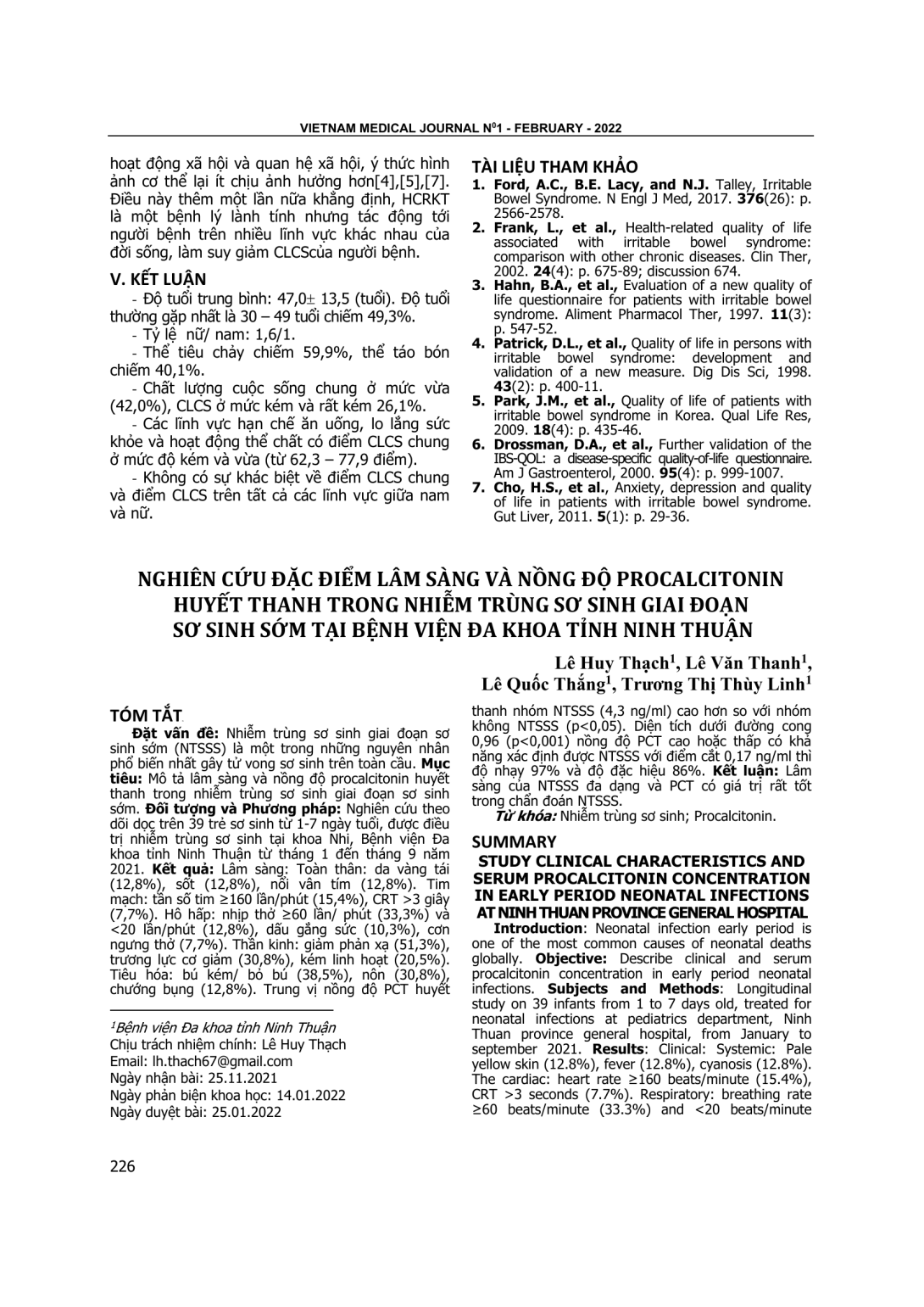 Nhiễm trùng sơ sinh giai đoạn sơ sinh sớm (NTSSS) là một trong những nguyên nhân phổ biến nhất gây tử vong sơ sinh trên toàn cầu. Mục tiêu: Mô tả lâm sàng và nồng độ procalcitonin huyết thanh trong nhiễm trùng sơ sinh giai đoạn sơ sinh sớm. Đối tượng và Phương pháp: Nghiên cứu theo dõi dọc trên 39 trẻ sơ sinh từ 1-7 ngày tuổi, được điều trị nhiễm trùng sơ sinh tại khoa Nhi, Bệnh viện Đa khoa tỉnh Ninh Thuận từ tháng 1 đến tháng 9 năm 2021. Kết quả: Lâm sàng: Toàn thân: da vàng tái (12,8%), sốt (12,8%), nổi vân tím (12,8%). Tim mạch: tần số tim ≥160 lần/phút (15,4%), CRT >3 giây (7,7%). Hô hấp: nhịp thở ≥60 lần/ phút (33,3%) và <20 lần/phút (12,8%), dấu gắng sức (10,3%), cơn ngưng thở (7,7%). Thần kinh: giảm phản xạ (51,3%), trương lực cơ giảm (30,8%), kém linh hoạt (20,5%). Tiêu hóa: bú kém/ bỏ bú (38,5%), nôn (30,8%), chướng bụng (12,8%). Trung vị nồng độ PCT huyết thanh nhóm NTSSS (4,3 ng/ml) cao hơn so với nhóm không NTSSS (p<0,05). Diện tích dưới đường cong 0,96 (p<0,001) nồng độ PCT cao hoặc thấp có khả năng xác định được NTSSS với điểm cắt 0,17 ng/ml thì độ nhạy 97% và độ đặc hiệu 86%. Kết luận: Lâm sàng của NTSSS đa dạng và PCT có giá trị rất tốt trong chẩn đoán NTSSS.