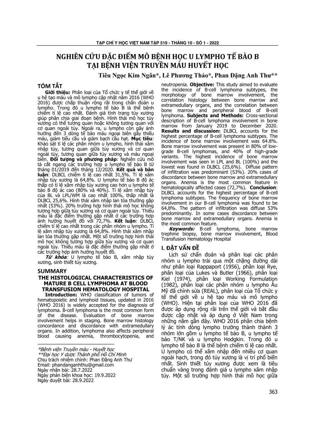 Phân loại của Tổ chức y tế thế giới về u hệ tạo máu và mô lympho cập nhật năm 2016 (WHO 2016) được chấp thuận rộng rãi trong chẩn đoán u lympho. Trong đó u lympho tế bào B là thể bệnh chiếm tỉ lệ cao nhất. Đánh giá tình trạng tủy xương giúp phân chia giai đoạn bệnh. Hình thái mô học tủy xương có thể tương quan hoặc không tương quan với cơ quan ngoài tủy. Ngoài ra, u lympho còn gây ảnh hưởng đến 3 dòng tế bào máu ngoại biên gây thiếu máu, giảm tiểu cầu và giảm bạch cầu hạt. Mục tiêu: Khảo sát tỉ lệ các phân nhóm u lympho, hình thái xâm nhập tủy, tương quan giữa tủy xương và cơ quan ngoài tủy, tương quan giữa tủy xương và máu ngoại biên. Đối tượng và phương pháp: Nghiên cứu mô tả cắt ngang các trường hợp u lympho tế bào B từ tháng 01/2019 đến tháng 12/2020. Kết quả và bàn luận: DLBCL chiếm tỉ lệ cao nhất 31,5%. Tỉ lệ xâm nhập tủy xương là 64,8%. U lympho tế bào B độ ác thấp có tỉ lệ xâm nhập tủy xương cao hơn u lympho tế bào B độ ác cao (80% và 40%). Tỉ lệ xâm nhập tủy của BL và LPL/WM là cao nhất 100%, thấp nhất là DLBCL 25,6%. Hình thái xâm nhập lan tỏa thường gặp nhất (53%). 20% trường hợp hình thái mô học không tương hợp giữa tủy xương và cơ quan ngoài tủy. Thiếu máu là đặc điểm thường gặp nhất ở các trường hợp ảnh hưởng huyết đồ với 72,7%. Kết luận: DLBCL chiếm tỉ lệ cao nhất trong các phân nhóm u lympho. Tỉ lệ xâm nhập tủy xương là 64,8%. Hình thái xâm nhập lan tỏa thường gặp nhất. Một số trường hợp hình thái mô học không tương hợp giữa tủy xương và cơ quan ngoài tủy. Thiếu máu là đặc điểm thường gặp nhất ở các trường hợp ảnh hưởng huyết đồ.
