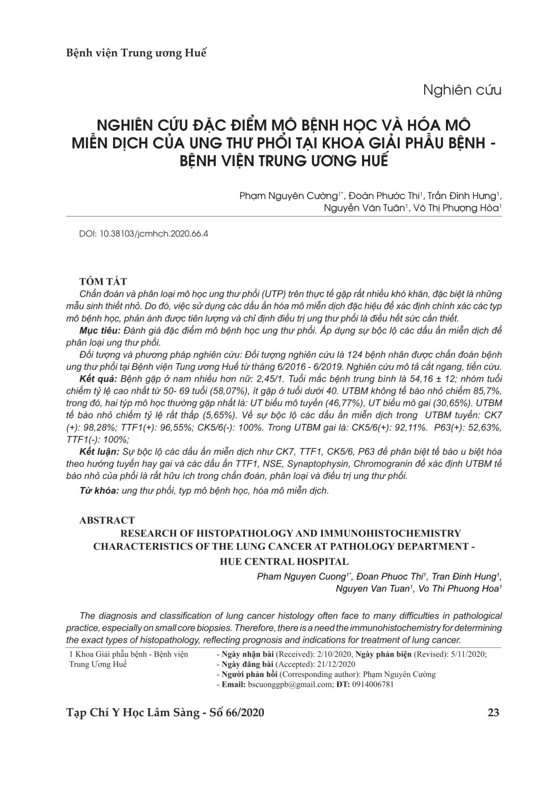 The diagnosis and classification of lung cancer histology often face to many difficulties in pathological practice, especially on small core biopsies. Therefore, there is a need the immunohistochemistry for determining the exact types of histopathology, reflecting prognosis and indications for treatment of lung cancer. Evaluation characteristics histological of lung cancer. Applying the revealing of immunohistochemistry to classify the lung cancer. Through a study on 124 patients were diagnosed as lung cancer at Hue Central Hospital from June, 2016 to June, 2019. Prospective, descriptive, cross- sectional study. Results - Ratio Male Female 2,45 / 1. The average age is disease 54,16 ± 12, the lowest age 17, maximum 77. The highest group is 50-69 years old (58,07%). The two most common types of histology are adenocarcinoma (46.77%), squamous cell carcinoma (30.65%), Small cell mesothelioma accounts for a very low rate (5.65%). - On the expression of immunohistochemistry markers in adenocarcinoma CK7 (+) 98.28%; TTF1 (+) 96.55%; CK5 / 6 (-) 100%, in squamous cell carcinoma CK5 / 6 (+) 92.11%. P63 (+) 52.63%, TTF1 (-) 100%. Conclusion The expression of immunohistochemistry markers such as CK7, TTF1, CK 5/6, P63 distinguishes between the gland cells and squamous cell, while immunohistochemistry markers such as TTF1, NSE, Synaptophysin, Chromogranin to identify small cell carcinoma of the lung are very useful in diagnosing, classifying and treating the lung cancer.