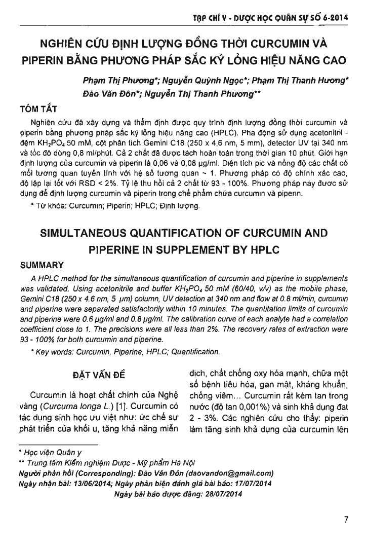 Nghiên cứu định lượng đồng thời Curcumin và piperin bằng phương pháp sắc ký lỏng hiệu năng cao