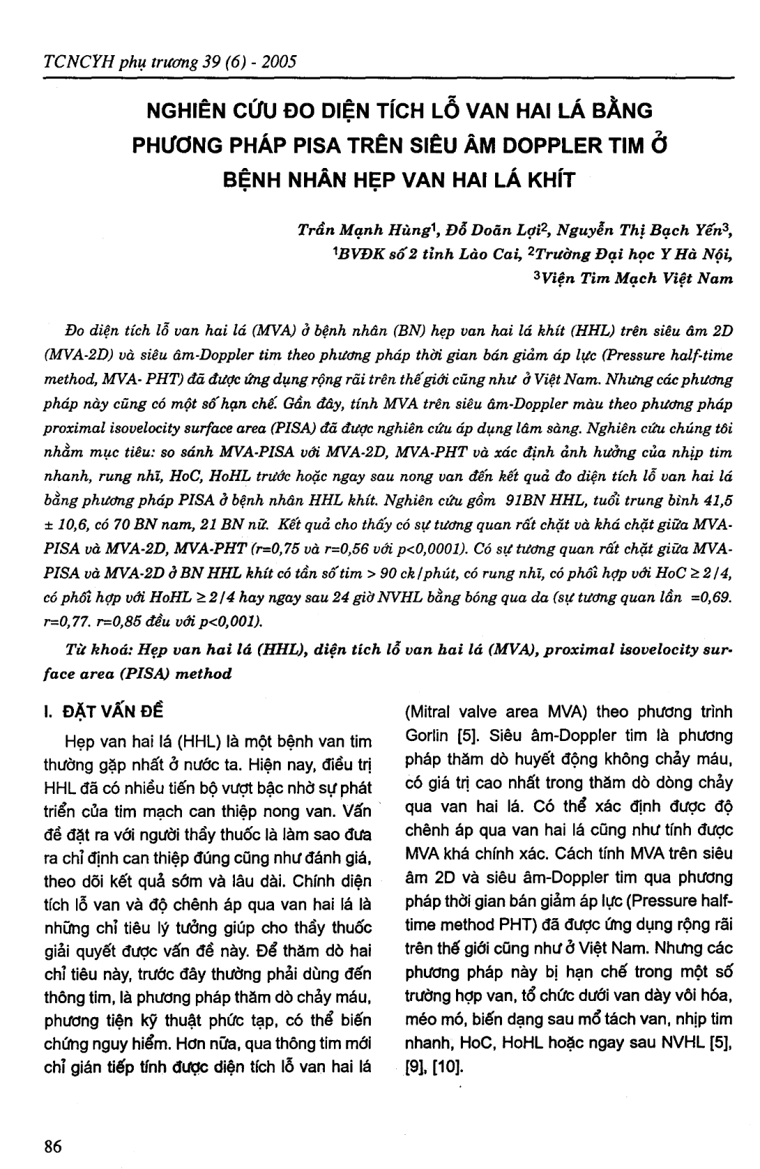 Nghiên cứu tác dụng của phương pháp PISA trong xác định diên jtích lỗ van hai lá ở bệnh nhân hẹp van hai lá khít, có so sánh với phương pháp 2D và phương pháp thời gian bán áp lực trên siêu âm Doppler - tim. Tìm hiểu một số yếu tố ảnh hưởng đến kết quả xác định diện tích lỗ van hai lá bằng phương pháp PISA ở bệnh nhân hẹp van hai lá khít.