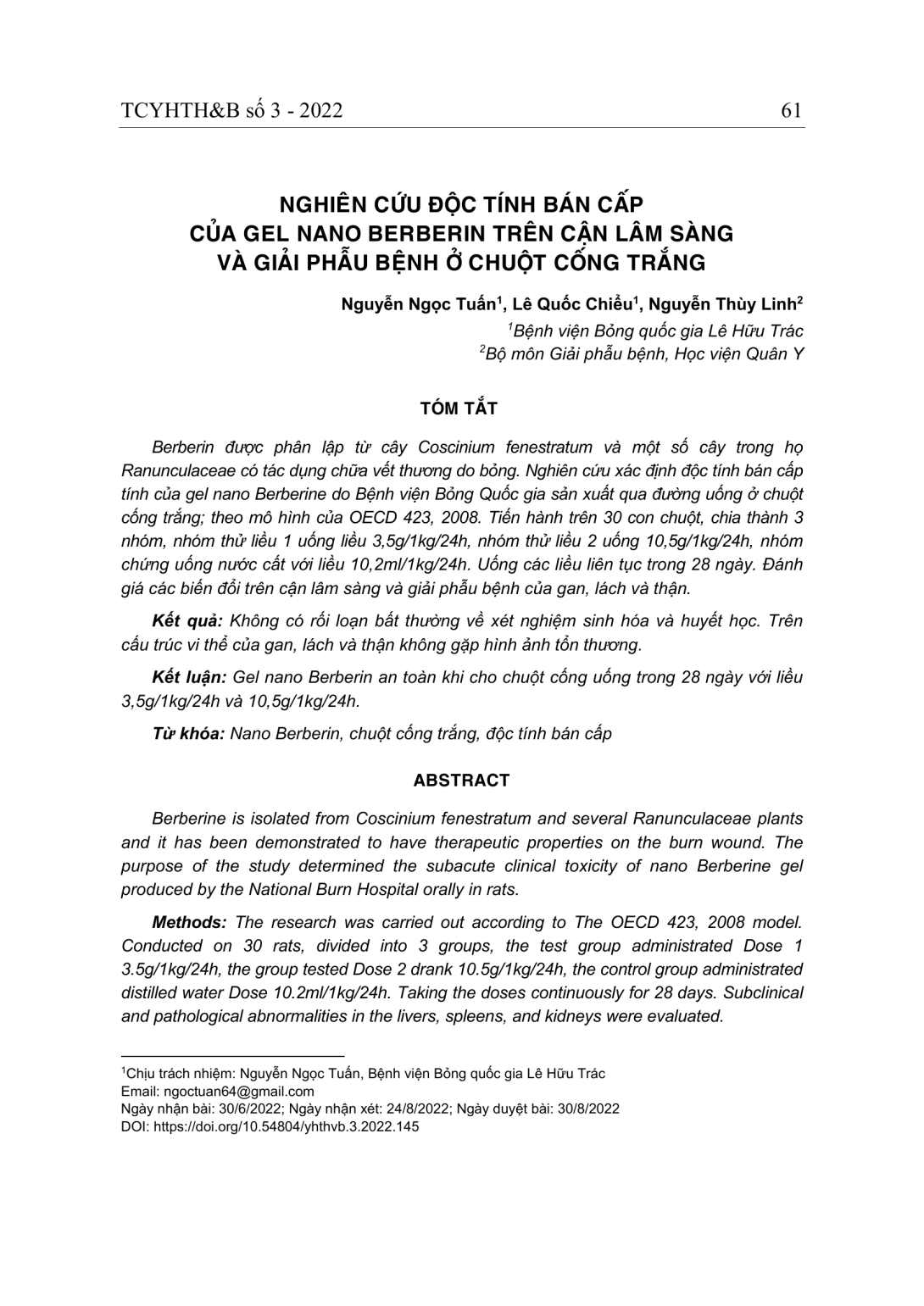Berberin được phân lập từ cây Coscinium fenestratum và một số cây trong họ Ranunculaceae có tác dụng chữa vết thương do bỏng. Nghiên cứu xác định độc tính bán cấp tính của gel nano Berberine do Bệnh viện Bỏng Quốc gia sản xuất qua đường uống ở chuột cống trắng; theo mô hình của OECD 423, 2008. Tiến hành trên 30 con chuột, chia thành 3 nhóm, nhóm thử liều 1 uống liều 3,5g/1kg/24h, nhóm thử liều 2 uống 10,5g/1kg/24h, nhóm chứng uống nước cất với liều 10,2ml/1kg/24h. Uống các liều liên tục trong 28 ngày. Đánh giá các biến đổi trên cận lâm sàng và giải phẫu bệnh của gan, lách và thận. Kết quả: Không có rối loạn bất thường về xét nghiệm sinh hóa và huyết học. Trên cấu trúc vi thể của gan, lách và thận không gặp hình ảnh tổn thương. Kết luận: Gel nano Berberin an toàn khi cho chuột cống uống trong 28 ngày với liều 3,5g/1kg/24h và 10,5g/1kg/24h.