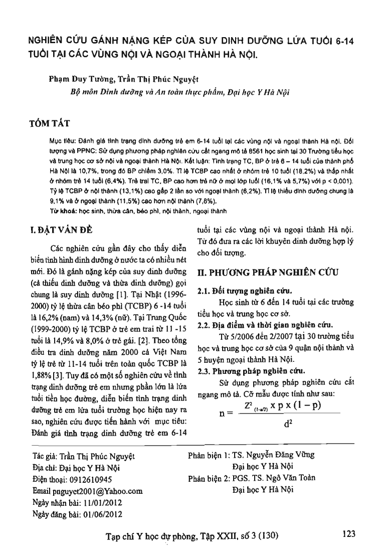 Objectives: Assesses nutrition status of the children 6-14 year olds in urban and uuburban area of Hanoi. Method: Crosssection study was using of 8561 pupils in 30 primary and secondary school in urban and suburban area of Hanoi. Conclusion: Overweight and obesity rate of pupils 6-14 of ages in urban area was 10.7 percent including obesity was 3.0 percent. The highest proportion overweight and obesity belong to 10 year old (18.2 percent) and the lowest rate in 14 year (6.4 percent). The rate of overweight and obesity in boys was higher than girls (16.1 percent and 5.7 percent) with p 0.001). The proportion of overweight and obesity in urban area (13.1 percent) double times compare with suburban area (6.2 percent). Undernutrition rate was 9.1 percent and in suburban area (11.5 percent) higher than urban area (7.8 percent).