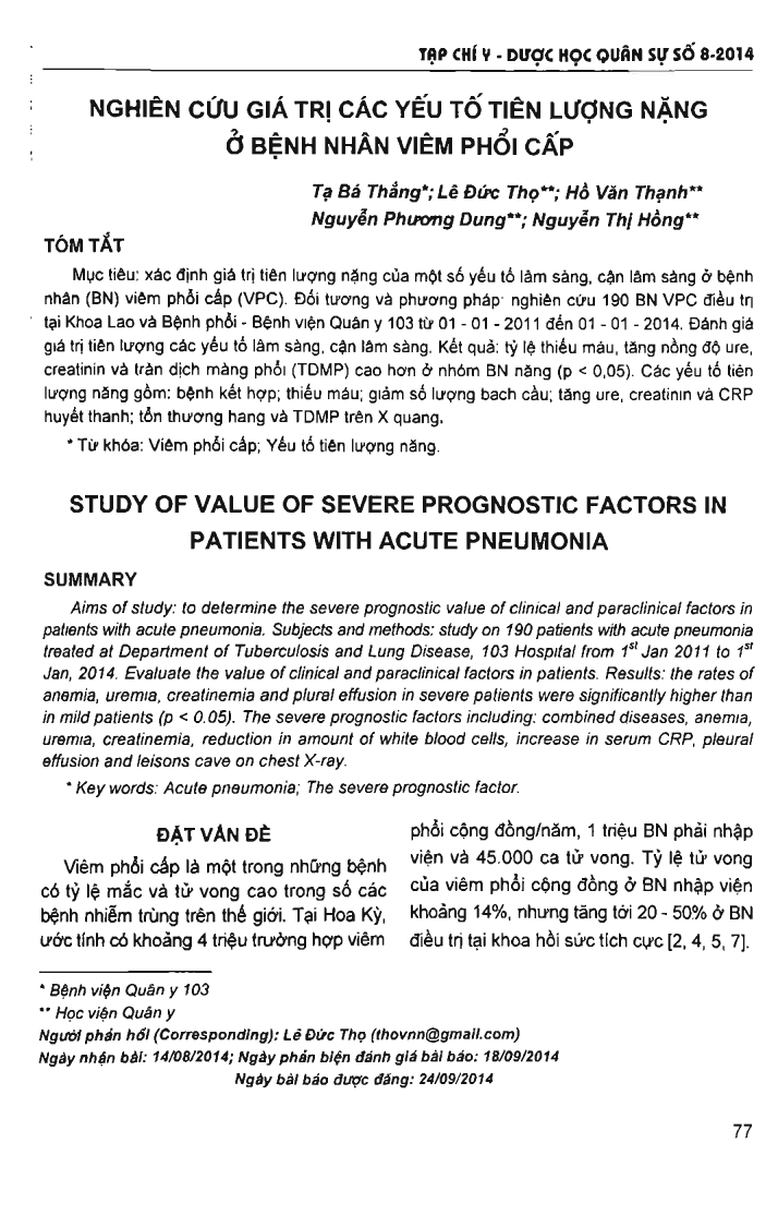 Nghiên cứu giá trị các yếu tố tiên lượng nặng ở bệnh nhân viêm phổi cấp