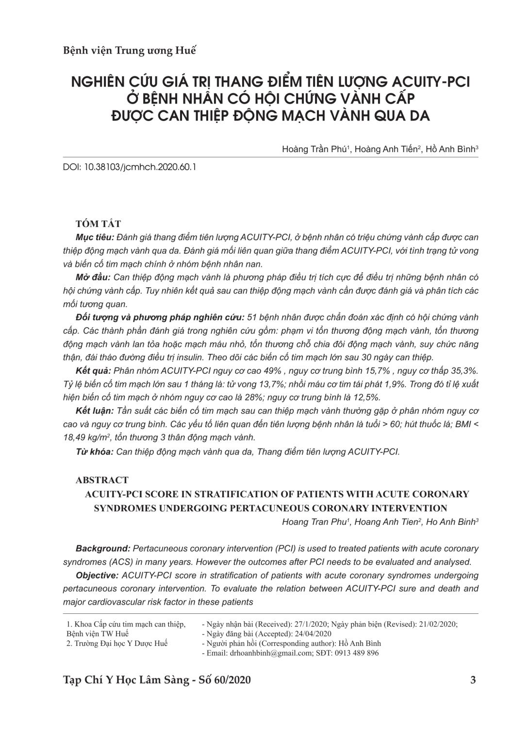 Đánh giá thang điểm tiên lượng ACUITY-PCI, ở bệnh nhân có triệu chứng vành cấp được can thiệp động mạch vành qua da. Đánh giá mối liên quan giữa thang điểm ACUITY-PCI, với tình trạng tử vong và biến cố tim mạch chính ở nhóm bệnh nhân nan. Đối tượng và phương pháp nghiên cứu 51 bệnh nhân được chẩn đoán xác định có hội chứng vành cấp. Các thành phần đánh giá trong nghiên cứu gồm phạm vi tổn thương động mạch vành, tổn thương động mạch vành lan tỏa hoặc mạch máu nhỏ, tổn thương chỗ chia đôi động mạch vành, suy chức năng thận, đái tháo đường điều trị insulin. Theo dõi các biến cố tim mạch lớn sau 30 ngày can thiệp. Kết quả cho thấy phân nhóm ACUITY-PCI nguy cơ cao 49% , nguy cơ trung bình 15,7% , nguy cơ thấp 35,3%. Tỷ lệ biến cố tim mạch lớn sau 1 tháng là tử vong 13,7%; nhồi máu cơ tim tái phát 1,9%. Trong đó tỉ lệ xuất hiện biến cố tim mạch ở nhóm nguy cơ cao là 28%; nguy cơ trung bình là 12,5%.