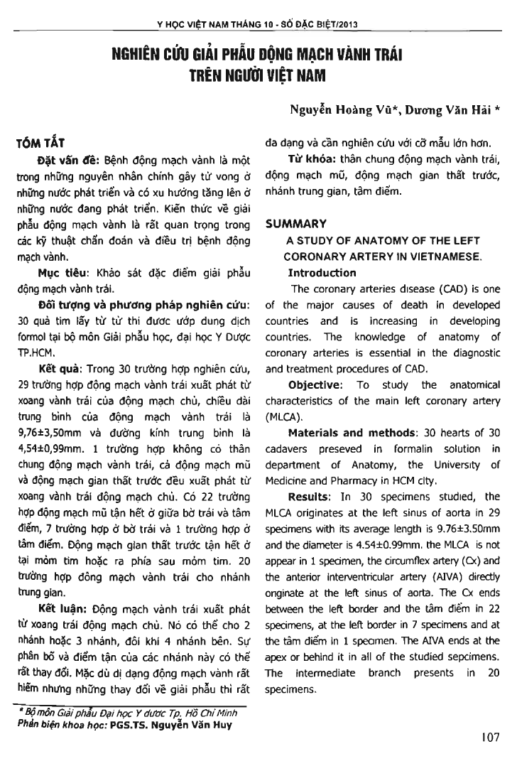 The coronary arteries disease (CAD) is one of the major causes of death in developed countries and is increasing in developing countries. The knowledge of anatomy of coronary arteries is essential in the diagnostic and treatment procedures of CAD. Objective: To study the anatomical characteristics of the main left coronary artery (MLCA). Materials and methods: 30 hearts of 30 cadavers preseved in formalin solution in department of Anatomy, the University of Medicine and Pharmacy in HCM city. Results: In 30 specimens studied, the MLCA originates at the left sinus of aorta in 29 specimens with its average length is 9.76 + or - 3.50mm and the diameter is 4.54 + or - 0.99mm. the MLCA is not appear in 1 specimen, the circumflex artery (0) and the anterior interventricular artery (AIVA) directly originate at the left sinus of aorta. The Cx ends between the left border and the tam diem in 22 specimens, at the left border in 7 specimens and at the tam diem in 1 specimen. The AlVA ends at the apex or behind it in all of the studied sepcimens. The intermediate branch presents in 20 specimens. Conclusion: The MLCA originates at the left sinus of aorta. It can divide into two branches, three branches and sometimes four branches. These branches may vary in distribution and terminal. Although the abnormality is very rare but the variation about anatomy of coronary artery is plentiful, it is need another research with more specimens.