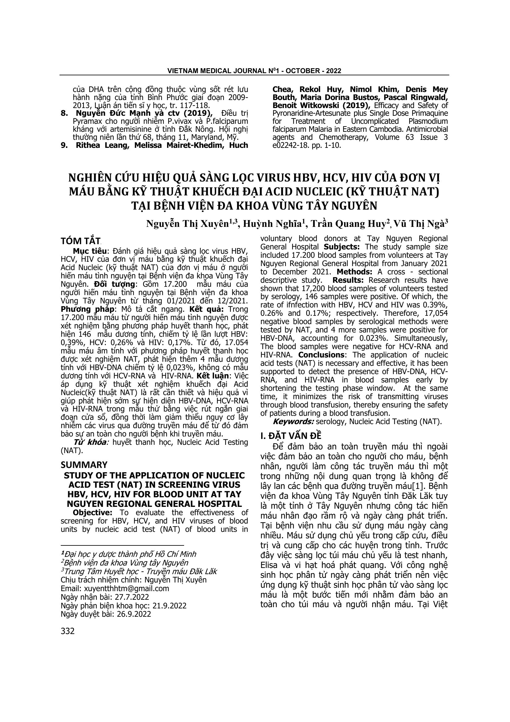 Đánh giá hiệu quả sàng lọc virus HBV, HCV, HIV của đơn vị máu bằng kỹ thuật khuếch đại Acid Nucleic (kỹ thuật NAT) của đơn vị máu ở người hiến máu tình nguyện tại Bệnh viện đa khoa Vùng Tây Nguyên. Đối tượng: Gồm 17.200 mẫu máu của người hiến máu tình nguyện tại Bệnh viện đa khoa Vùng Tây Nguyên từ tháng 01/2021 đến 12/2021. Phương pháp: Mô tả cắt ngang. Kết quả: Trong 17.200 mẫu máu từ người hiến máu tình nguyện được xét nghiệm bằng phương pháp huyết thanh học, phát hiện 146 mẫu dương tính, chiếm tỷ lệ lần lượt HBV: 0,39%, HCV: 0,26% và HIV: 0,17%. Từ đó, 17.054 mẫu máu âm tính với phương pháp huyết thanh học được xét nghiệm NAT, phát hiện thêm 4 mẫu dương tính với HBV-DNA chiếm tỷ lệ 0,023%, không có mẫu dương tính với HCV-RNA và HIV-RNA. Kết luận: Việc áp dụng kỹ thuật xét nghiệm khuếch đại Acid Nucleic(kỹ thuật NAT) là rất cần thiết và hiệu quả vì giúp phát hiện sớm sự hiện diện HBV-DNA, HCV-RNA và HIV-RNA trong mẫu thử bằng việc rút ngắn giai đoạn cửa sổ, đồng thời làm giảm thiểu nguy cơ lây nhiễm các virus qua đường truyền máu để từ đó đảm bảo sự an toàn cho người bệnh khi truyền máu.