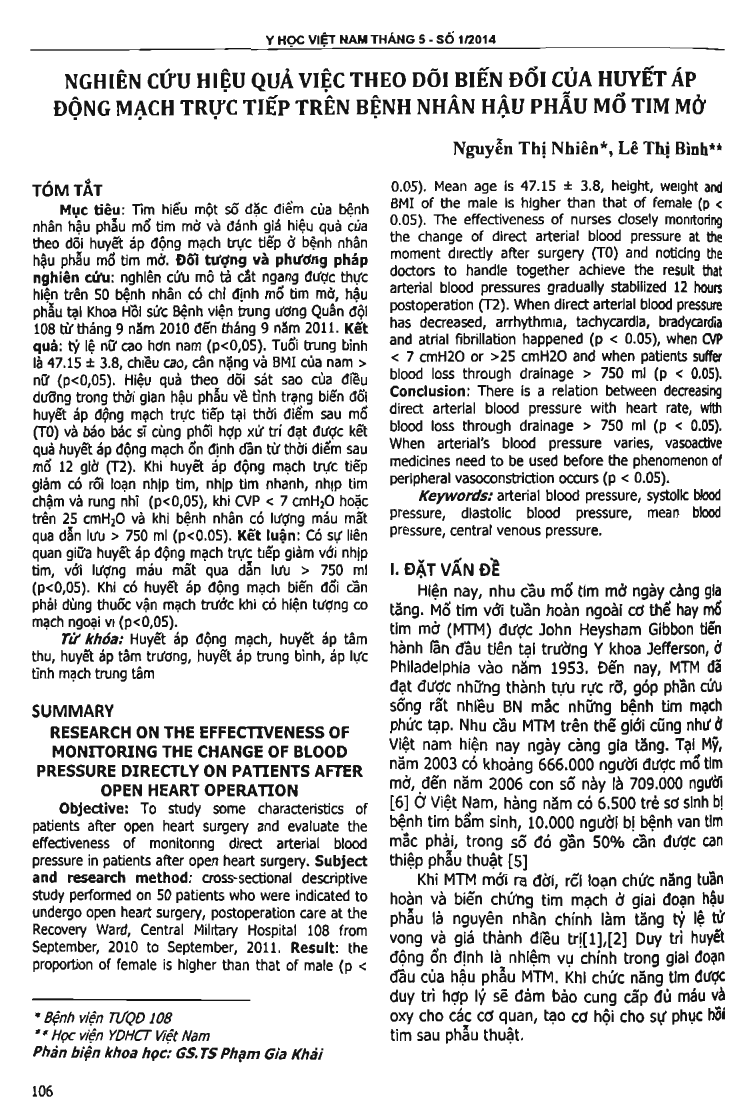 Objective: To study some characteristics of patients after open heart surgery and evaluate the effectiveness of monitoring direct arterial blood pressure in patients after open heart surgery. Subject and research method: cross-sectional descriptive study performed on 50 patients who were indicated to undergo open heart surgery, postoperation care at the Recovery Ward, Central Military Hospital No.108 from September, 2010 to September, 2011. Result: the proportion of female is higher than that of male (p 0.05). Mean age is 47.15 + or - 3.8, height, weight and BMI of the male is higher than that of female (p 0.05). The effectiveness of nurses closely monitoring the change of direct arterial blood pressure at the moment directly after surgery (T0) and noticing the doctors to handle together achieve the result that arterial blood pressures gradually stabilized 12 hours postoperation (T2). When direct arterial blood pressure has decreased, arrhythmia, tachycardia, bradycardia and atrial fibrillation happened (p 0.05), when CVP 7 cmH2O or 25 cmH2O and when patients suffer blood loss through drainage 750 ml (p 0.05). Conclusion: There is a relation between decreasing direct arterial blood pressure with heart rate, with blood loss through drainage 750 ml (p 0.05). When arterial's blood pressure varies, vasoactive medicines need to be used before the phenomenon of peripheral vasoconstriction occurs (p 0.05).
