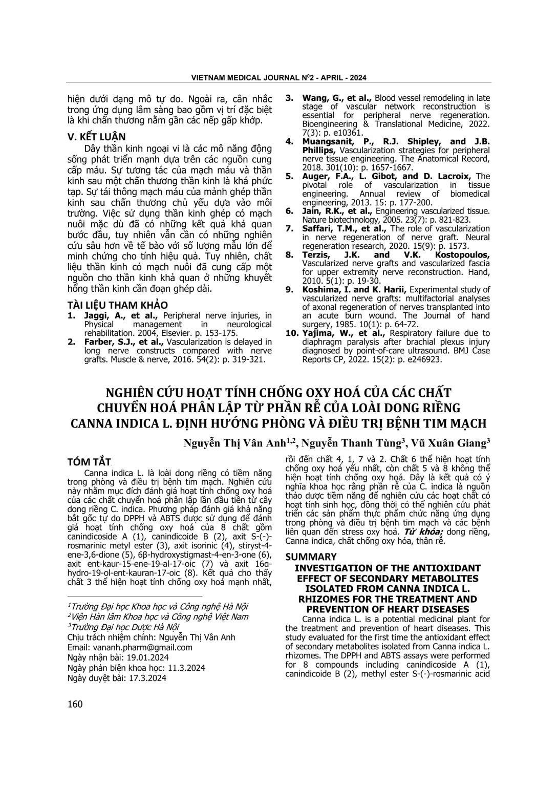 Canna indica L. là loài dong riềng có tiềm năng trong phòng và điều trị bệnh tim mạch. Nghiên cứu này nhằm mục đích đánh giá hoạt tính chống oxy hoá của các chất chuyển hoá phân lập lần đầu tiên từ cây dong riềng C. indica. Phương pháp đánh giá khả năng bắt gốc tự do DPPH và ABTS được sử dụng để đánh giá hoạt tính chống oxy hoá của 8 chất gồm canindicoside A (1), canindicoide B (2), axit S-(-)-rosmarinic metyl ester (3), axit isorinic (4), stiryst-4-ene-3,6-dione (5), 6β-hydroxystigmast-4-en-3-one (6), axit ent-kaur-15-ene-19-al-17-oic (7) và axit 16α-hydro-19-ol-ent-kauran-17-oic (8). Kết quả cho thấy chất 3 thể hiện hoạt tính chống oxy hoá mạnh nhất, rồi đến chất 4, 1, 7 và 2. Chất 6 thể hiện hoạt tính chống oxy hoá yếu nhất, còn chất 5 và 8 không thể hiện hoạt tính chống oxy hoá. Đây là kết quả có ý nghĩa khoa học rằng phần rễ của C. indica là nguồn thảo dược tiềm năng để nghiên cứu các hoạt chất có hoạt tính sinh học, đồng thời có thể nghiên cứu phát triển các sản phẩm thực phẩm chức năng ứng dụng trong phòng và điều trị bệnh tim mạch và các bệnh liên quan đến stress oxy hoá.