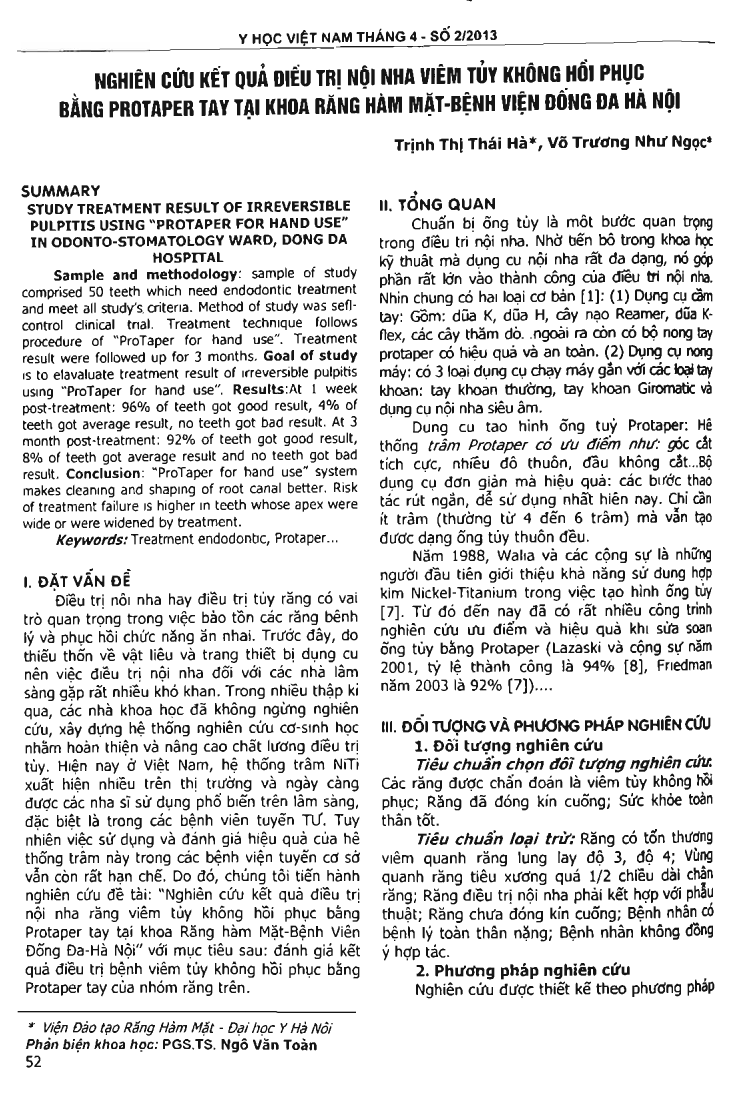 Sample and methodology: sample of study comprised 50 teeth which need endodontic treatment and meet all study's. criteria. Method of study was seflcontrol clinical trial. Treatment technique follows procedure of "ProTaper for hand use". Treatment result were followed up for 3 months. Goal of study is to elavaluate treatment result of irreversible pulpitis using "ProTaper for hand use". Results:At 1 week post-treatment: 96 percent of teeth got good result, 4 percent of teeth got average result, no teeth got bad result. At 3 month post-treatment: 92 percent of teeth got good result, 8 percent of teeth got average result and no teeth got bad result. Conclusion: "ProTaper for hand use" system makes cleaning and shaping of root canal better. Risk of treatment failure is higher in teeth whose apex were wide or were widened by treatment.