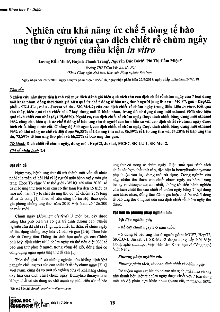 Nghiên cứu này được tiến hành với mục đích đánh giá hiệu quả tách thu cao dịch chiết rễ chùm ngây của 7 loại dung dịch môi khác nhau, đồng thời đánh giá hiệu quả ức chế 5 dòng tế bào ung thư ở người (ung thư vú - MCF7, gan - HepG2, phối - SK-LU-1, máu - Jurkat và da - SK-Mel-2) của cao dịch chiết rễ chùm ngây trong điều kiện in vitro. Kết quả cho thấy, hiệu quả tách chiết của 7 loại dung môi là khác nhau, trong đó sử dụng dung môi ethanol 96% cho hiệu quả tách chiết cao nhất (đạt 19,66%). Ngoài ra, cao dịch chiết rễ chùm ngây được tách chiết bằng dung môi ethanol 96%, cũng cho hiệu quả ức chế 5 dòng tế bào ung thư ở người cao hơn hẳn so với cao dịch chiết rót chùm ngây được tách chiết bằng nước cất. Ở nồng độ 500 ug/ml, cao dịch chiết rễ chùm ngây được tách chiết bằng dung môi ethanol 96% có khả năng ức chế và diệt được 96,38% tế bào ung thư máu, 86,39% tế bào ung thư vú, 74,28% tế bào ung da, 73,89% tế bào ung thư phổi và 66,22% tế bào ung thư gan.
