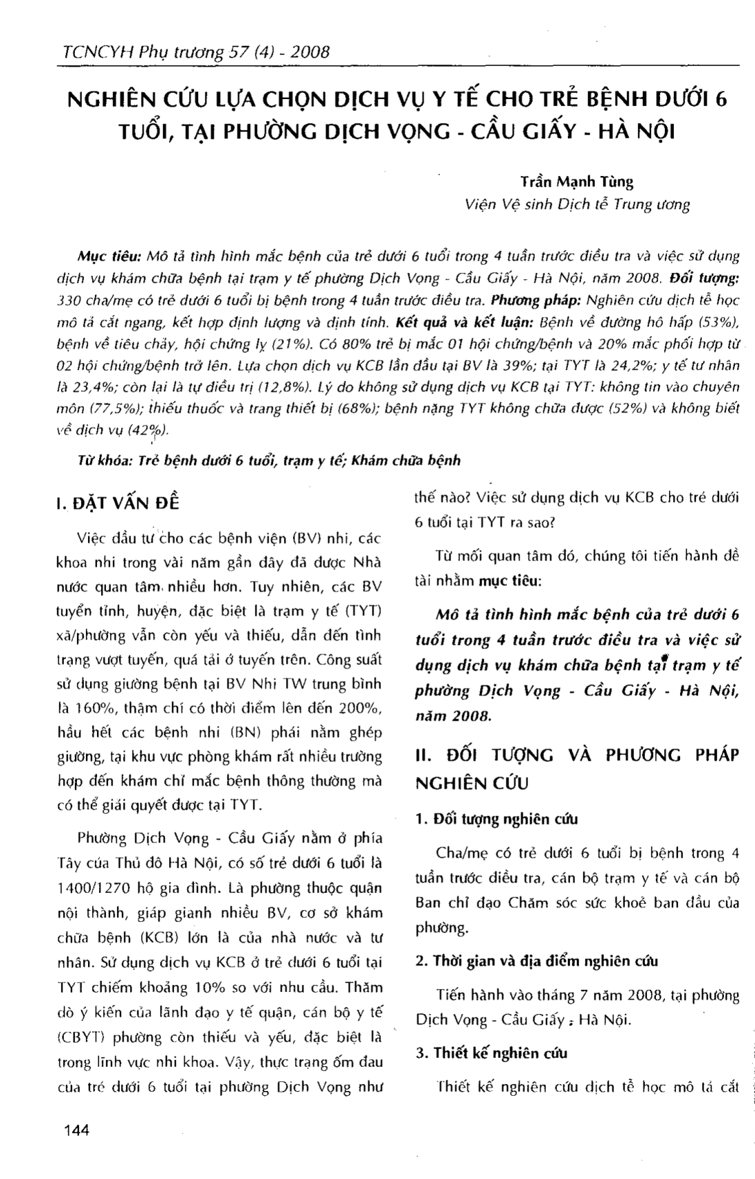 Nghiên cứu lựa chọn dịch vụ y tế cho trẻ bệnh dưới 6 tuổi tại phường Dịch Vọng - Cầu Giấy - Hà Nôi