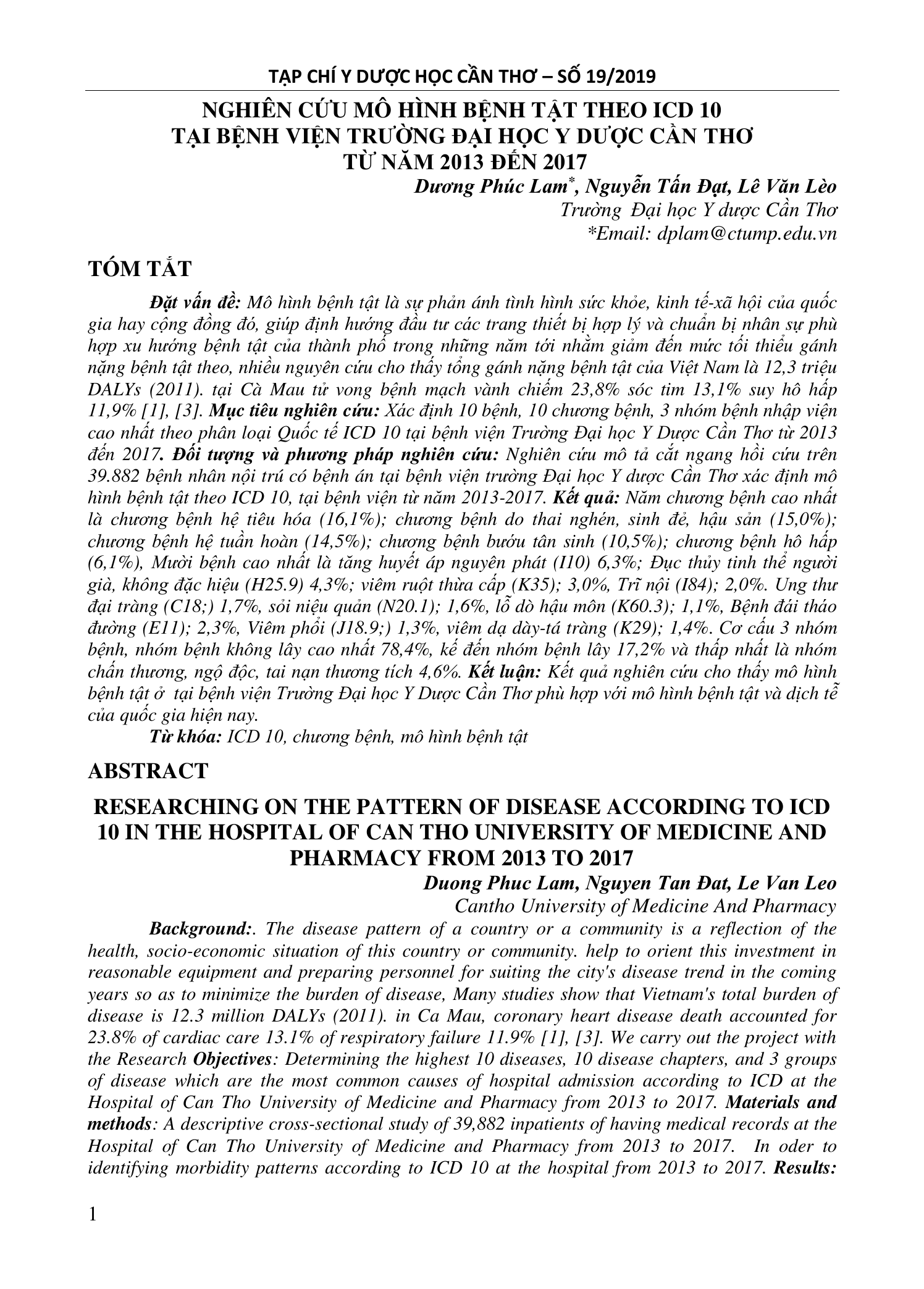 Xác định 10 bệnh, 10 chương bệnh, 3 nhóm bệnh nhập viện cao nhất theo phân loại Quốc tế ICD 10 tại bệnh viện Trường Đại học Y Dược Cần Thơ từ 2013 đến 2017. Nghiên cứu mô tả cắt ngang hồi cứu trên 39.882 bệnh nhân nội trú có bệnh án tại bệnh viện trường Đại học Y dược Cần Thơ xác định mô hình bệnh tật theo ICD 10, tại bệnh viện từ năm 2013-2017. Kết quả Năm chương bệnh cao nhất là chương bệnh hệ tiêu hóa (16,1%); chương bệnh do thai nghén, sinh đẻ, hậu sản (15,0%); chương bệnh hệ tuần hoàn (14,5%); chương bệnh bướu tân sinh (10,5%); chương bệnh hô hấp (6,1%), Mười bệnh cao nhất là tăng huyết áp nguyên phát (I10) 6,3%; Đục thủy tinh thể người già, không đặc hiệu (H25.9) 4,3%; viêm ruột thừa cấp (K35); 3,0%, Trĩ nội (I84); 2,0%. Ung thư đại tràng (C18;) 1,7%, sỏi niệu quản (N20.1); 1,6%, lỗ dò hậu môn (K60.3); 1,1%, Bệnh đái tháo đường (E11); 2,3%, Viêm phổi (J18.9;) 1,3%, viêm dạ dày-tá tràng (K29); 1,4%. Cơ cấu 3 nhóm bệnh, nhóm bệnh không lây cao nhất 78,4%, kế đến nhóm bệnh lây 17,2% và thấp nhất là nhóm chấn thương, ngộ độc, tai nạn thương tích 4,6%.