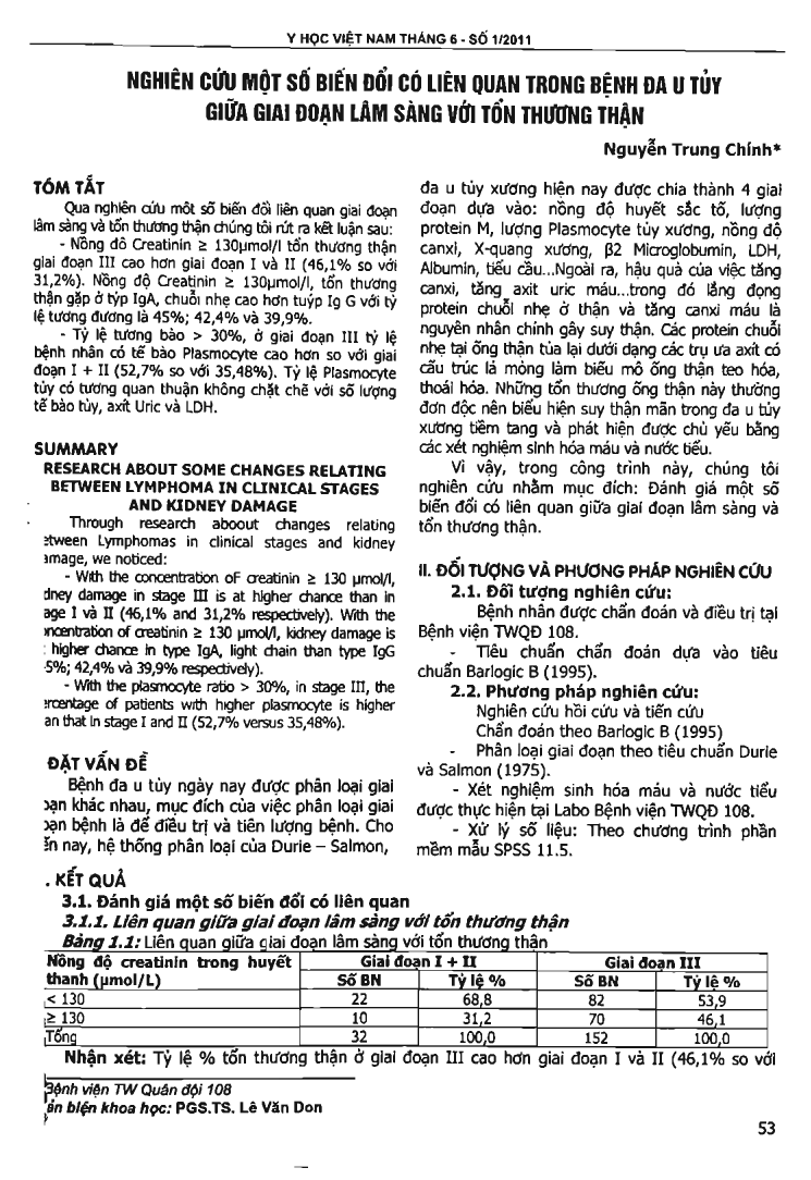 Nghiên cứu một số biến đổi có liên quan trong bệnh đa u tủy giữa giai đoạn lâm sàng với tổn thương thận
