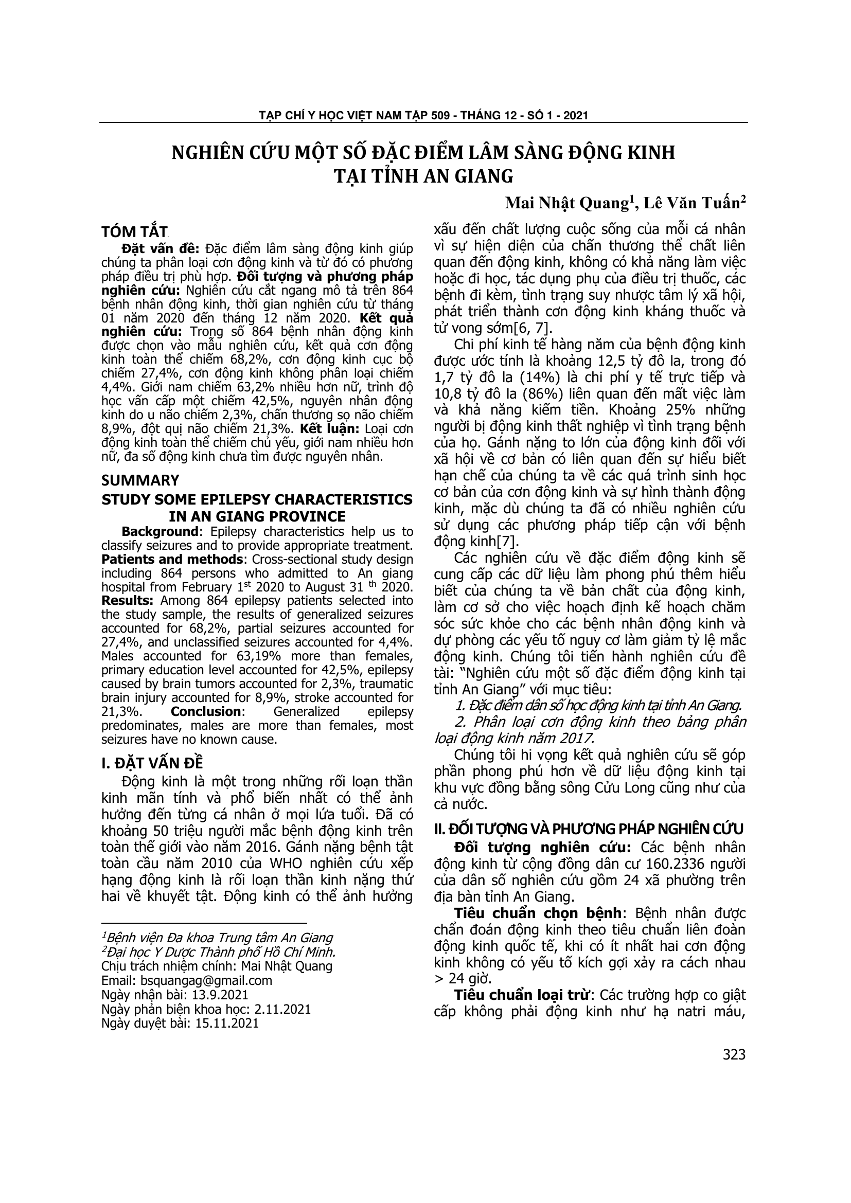 Đặc điểm lâm sàng động kinh giúp chúng ta phân loại cơn động kinh và từ đó có phương pháp điều trị phù hợp. Đối tượng và phương pháp nghiên cứu: Nghiên cứu cắt ngang mô tả trên 864 bệnh nhân động kinh, thời gian nghiên cứu từ tháng 01 năm 2020 đến tháng 12 năm 2020. Kết quả nghiên cứu: Trong số 864 bệnh nhân động kinh được chọn vào mẫu nghiên cứu, kết quả cơn động kinh toàn thể chiếm 68,2%, cơn động kinh cục bộ chiếm 27,4%, cơn động kinh không phân loại chiếm 4,4%. Giới nam chiếm 63,2% nhiều hơn nữ, trình độ học vấn cấp một chiếm 42,5%, nguyên nhân động kinh do u não chiếm 2,3%, chấn thương sọ não chiếm 8,9%, đột quị não chiếm 21,3%. Kết luận: Loại cơn động kinh toàn thể chiếm chủ yếu, giới nam nhiều hơn nữ, đa số động kinh chưa tìm được nguyên nhân.