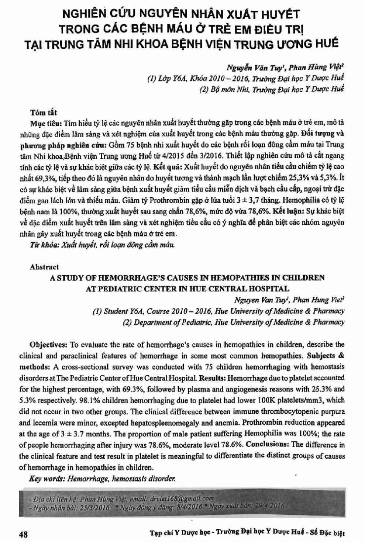Nghiên cứu nguyên nhân xuất huyết trong các bệnh máu trên 75 bệnh nhi điều trị tại Trung tâm Nhi khoa, bệnh viện Trung ương Huế từ 4/2015 đến 3/2016. Nghiên cứu cho thấy sự khác biệt về đặc điểm xuất huyết trên lâm sàng và xét nghiệm tiểu cầu có ỹ nghĩa để phân biệt các nhóm nguyên nhân gây xuất huyết trong các bệnh máu ở trẻ em.