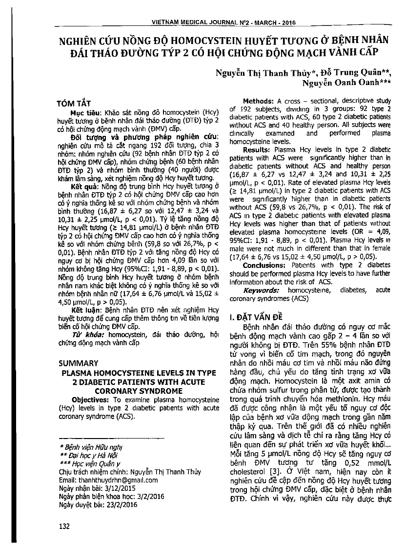 Nghiên cứu nồng độ homocystein huyết tương ở bệnh nhân đái tháo đường typ 2 có hội chứng động mạch vành cấp