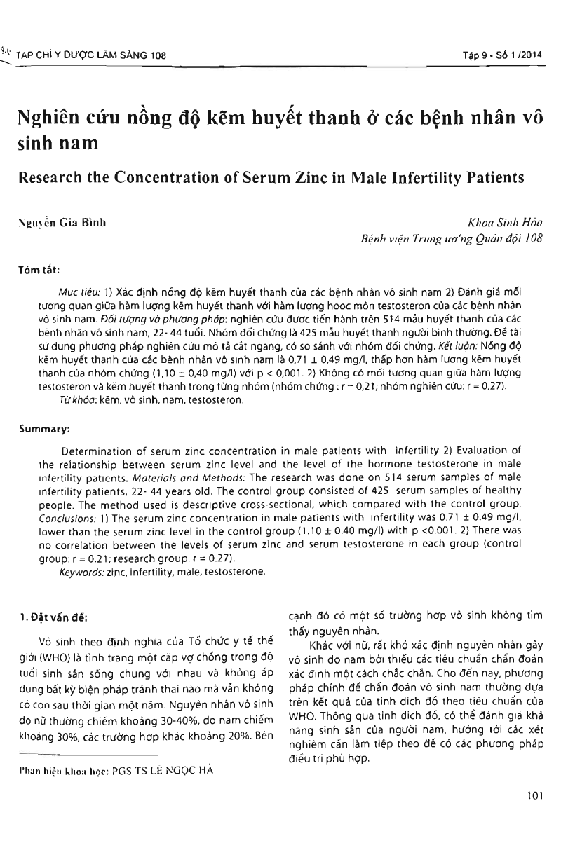 Determination of serum zinc concentration in male patients with infertility and evaluation of the relationship between serum zinc level and the level of the hormone testosterone in male infertility patients. Materials and Methods: The research was done on 514 serum samples of male infertility patients, 22- 44 years old. The control group consisted of 425 serum samples of healthy people. The method used is descriptive cross-sectional, which compared with the control group. Conclusions: 1) The serum zinc concentration in male patients with infertility was 0.71 + or - 0.49 mg/l, lower than the serum zinc level in the control group (1.10 + or - 0.40 mg/l) with p 0.001. 2) There was no correlation between the levels of serum zinc and serum testosterone in each group (controlgroup: r